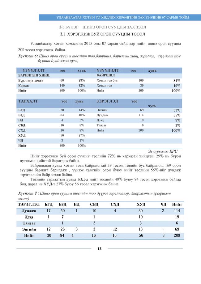 Өнөөдрийн байдлаар төслүүдийн 47 хувь буюу 98 төсөл нь ашиглалтанд орсон бэлэн байр борлуулж байна. 45 хувь буюу 94 төсөл энэ онд, 6 хувь буюу 13 төсөл нь 2016 онд, 2 хувь буюу 4 төсөл нь 2017 онд ашиглалтанд орохоор төлөвлөгджээ.