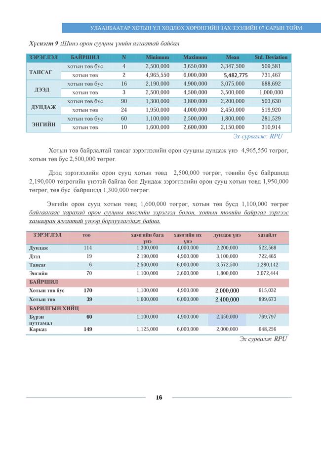 Мөн энгийн болон дундаж зэрэглэлийн орон сууцны ам метрийн дундаж үнэ 2,000,000, дээд болон тансаг зэрэглэлийн орон сууцны дундаж үнэ 3,495,000 төгрөг байгаа юм.