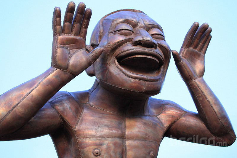 БНХАУ-ын уран бүтээлч Минжүн 1990-ээд оны Хятадын улс төрийн увиагүй үйлдлийн хариу болгон уран сайхны аргаар эсэргүүцлээ илэрхийлэх зорилгоор уг хөшөөг бүтээжээ. Ингэхдээ өөрийн царайгаа шингээж, гурван метр өндөртэй, бүрэн шүдтэйгээр хийжээ. Барималын өмнөх цементэн дээр сийлэхдээ "Энэ хөшөөг үзсэн бүх хүмүүст инээд наргиа урам зориг, баяр баяслыг хайрлах болно." хэмээжээ.