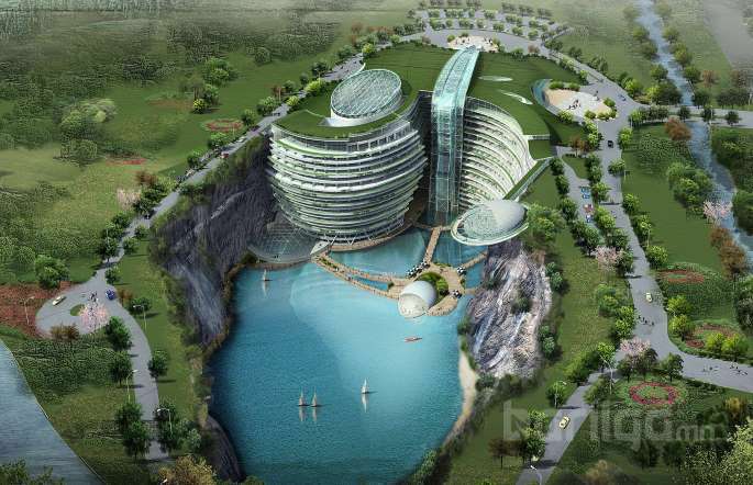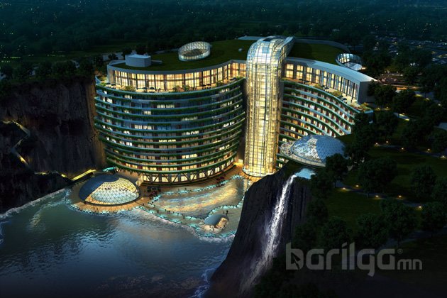 Энэхүү зочид буудал БНХАУ-ын Сунцян хотод баригдахаар төлөвлөгджээ. Барилга барих уг газарт гүний ил уурхайн 90-100 метр гүн нүх байсныг сэргээн засварлаж тансаг зэрэглэлийн “Sogjiang” нэртэй зочид буудлын барилгын ажил эхлүүлээд байна. Уг барилгын архитектурыг Японы Аткинс компаний баг шинэлэг байдлаар барилгын гадна талыг урсаж буй хүрхрээ мэт төлөвлөж өгсөн нь тун гайхалтай бүтээлч санаа болж чадсан юм. 19-н давхар зочид буудлын барилгыг даган урсаж буй хүрхээ нь хиймэл нууранд цутгадаг.