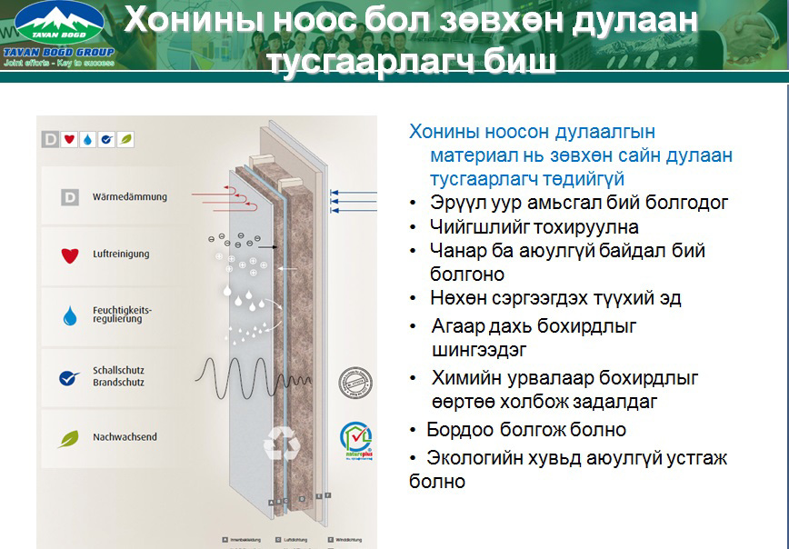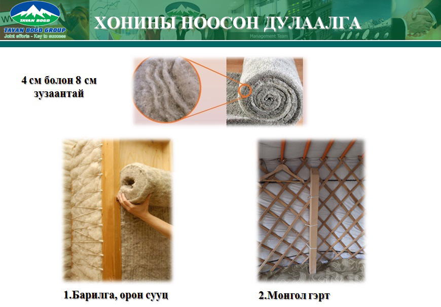 Таван Богд Инсулэйшн ХХК нь 2014 оны 1 сарын 13-нд Аж Үйлдвэрийн Яамны дэмжлэгтэйгээр байгуулагдаж, Монгол хонины ноосоор европын стандарт шаардлагыг бүрэн хангасан 100% хонины ноосон дулаалгын материалыг Австри улсын