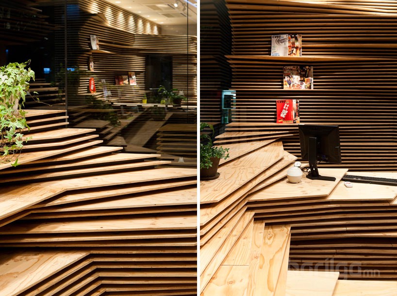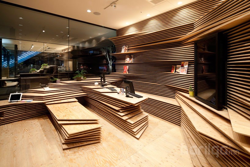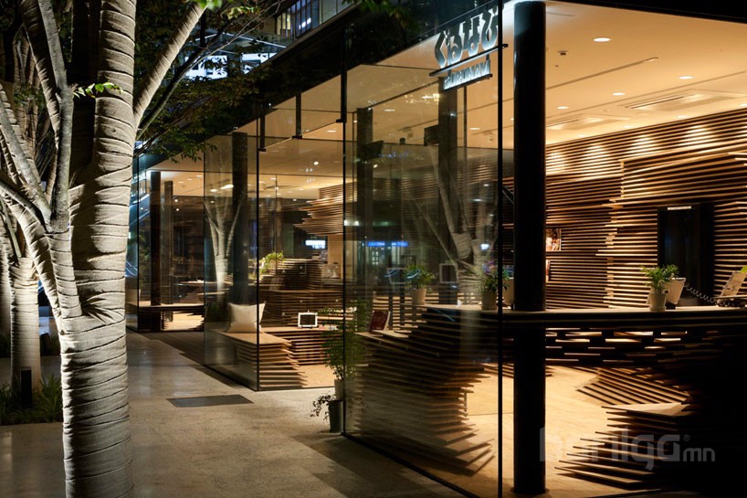 Япон улсын Осакад байрлах амралтын зориулалтай энэхүү барилгын интерьерийн шийдлийг Японы нэрт интерьер дизайнер Кенго Кума зохион бүтээжээ. Нийтдээ 82 мкв энэхүү өрөөний хана, ширээ, сандал, ор зэргийг бүгдийг нь модон давхраа үүсгэн хийж өгсөн нь өрөөг том саруулхан харагдуулахаас гадна өнгө дизайны гайхалтай орчин бүрдүүлж чаджээ.