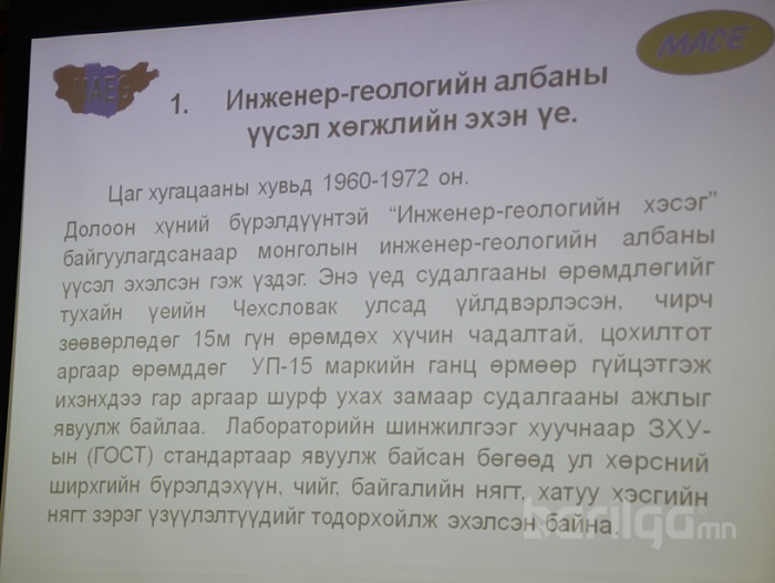 - Семинарыг нээж " Монголын инженер-геологийн холбооны ерөнхийлөгч О. Балддорж " Монголын инженер-геологийн албаны хөгжил 55 жилд сэдвээр илтгэл тавьсан юм.