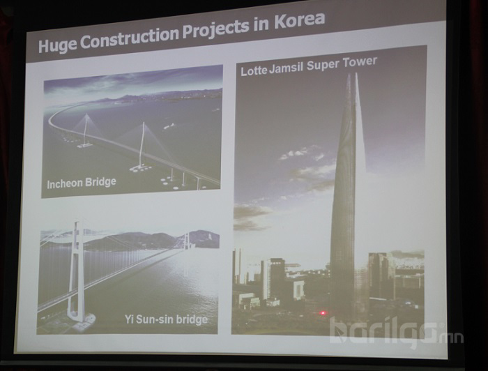Тэрээр илтгэлдээ Солонгос улсад баригдаж буй томоохон бүтээн байгуулалтуудын дэвшилтэт технологи ашигласан байдал, барилгын бүтээцийн талаар туршлагаасаа хуваалцлаа.