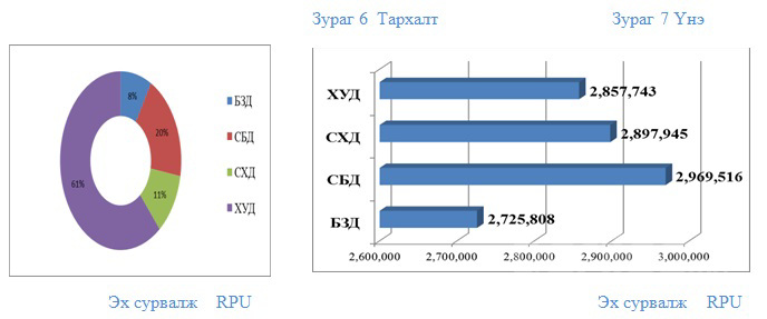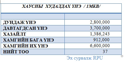 1 метр квадратын дундаж үнэ хамгийн өндөр нь Сүхбаатар дүүрэгт 2,969,516 төгрөг, байгаа бол Сонгино хайрхан дүүрэгт 2,897,925 төгрөг, Хан Уул дүүрэгт 2,867,743 төгрөг, Баянзүрх дүүрэгт 2,725,808 төгрөгийн тус тус үнэтэй байна.