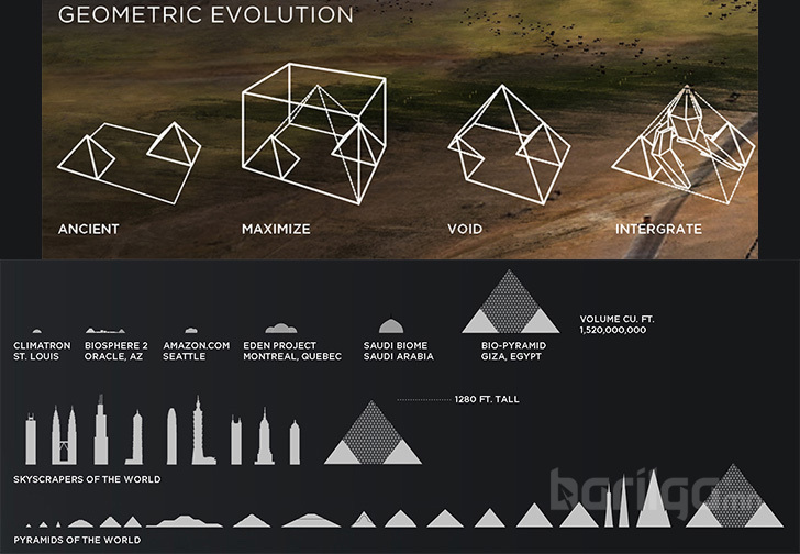 Төслийн багийнхан хэлэхдээ: Манай " Био-Пирамид " төсөл нь уламжлалт аялал жуулчлалын талаарх төсөөллийг эвдэх, жинхэнэ дэлхий нийтийн өөрчлөлт хийж дахин идэвхжүүлэх газар бий болгох зорилготой” гэжээ. 1280 футын өндөртэй "Био пирамид" газрын гүн дэх усан сантай холбогдох ба бохирдсон усыг дахин боловсруулах болон ус хураах систем нь усан хангамжийг нөхөн сэргээх юм. Тус байгууламж дотор музей, жижиглэн худалдааны төв, эрдэм шинжилгээний лаборатори, мөн их сургууль ч байрлах боломжтой.
