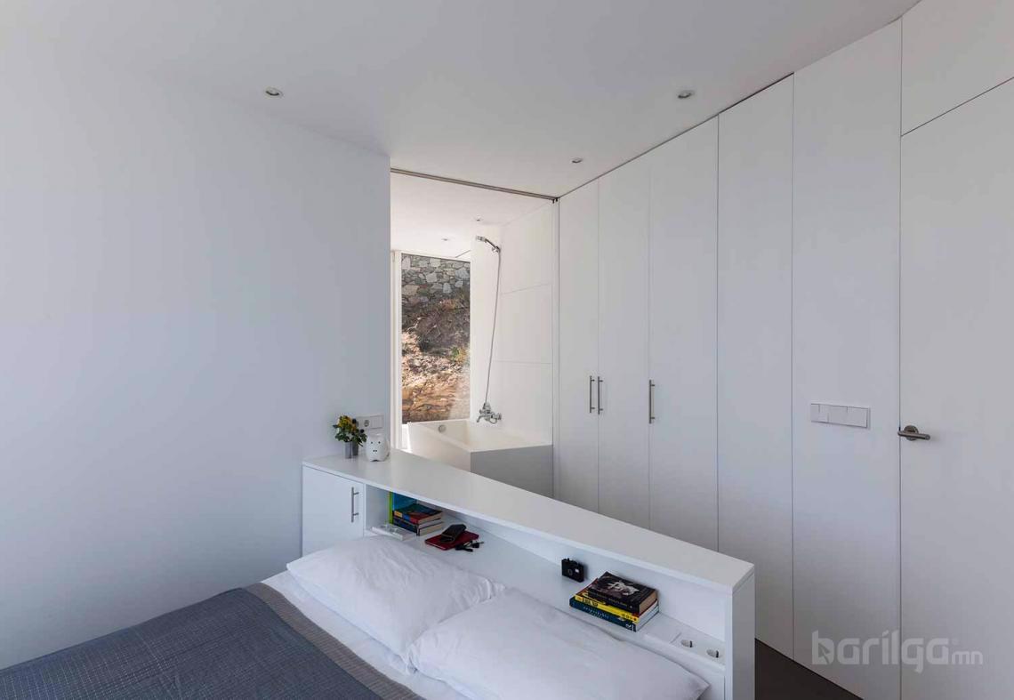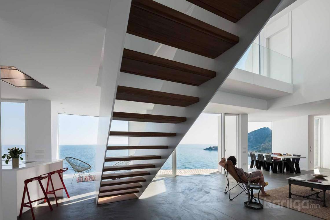 Дээд давхарт байрлах өрөөнүүдэд гоёмсог шатаар дамжин хүрэх ба уг давхарт унтлагын өрөө, хоёр угаалгын өрөө болон зочны өрөө байрладаг. Харин нэгдүгээр давхарт гал тогоо, байшингийн урд хэсэгт жижиг усан сан бий.
