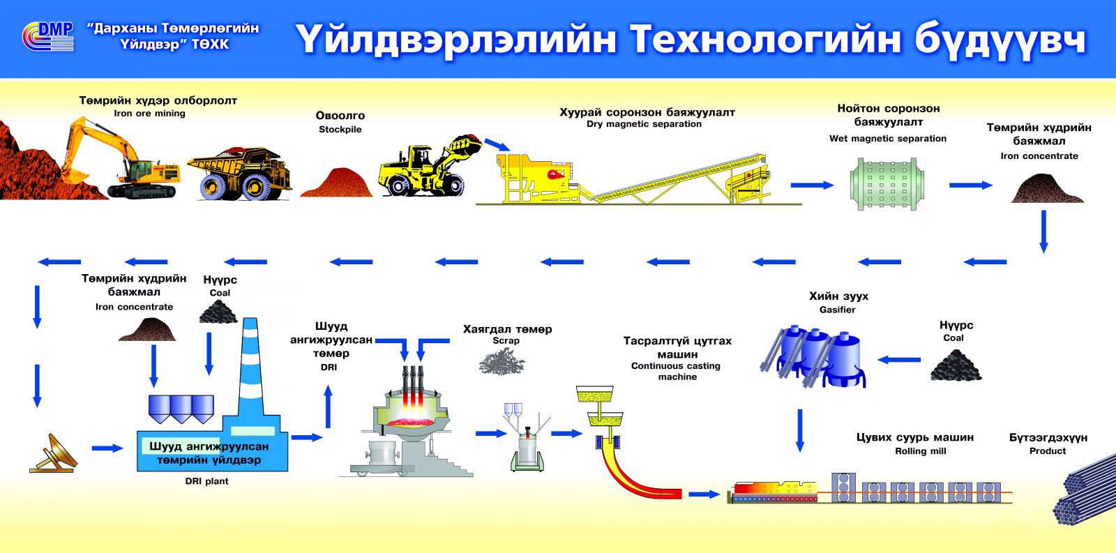 -Тийм шүү. Монгол улсын Засгийн газраас ган, цувимал бүтээгдэхүүн үйлдвэрлэх хүчин чадалтай металлургийн цогцолбор үйлдвэр байгуулж эхний ээлжинд ган хавтгай цувимал, төмөр утас, ган туйван, хэлбэржүүлсэн төмөр, ган хоолой, зам төмөр, хөндий хэлбэртүүд зэрэг цувимал бүтээгдэхүүнийг дотооддоо үйлдвэрлэхээр төлөвлөж байна. Өнөөдөр Дарханы төмөрлөгийн үйлдвэрийхэн эдийн засгийн үр ашгаа нэмэгдүүлэхийн зэрэгцээ үйлдвэрлэлийн ойрын болон стратеги зорилтуудаа тодорхойлон төмрийн хүдрийг гүн боловсруулж баяжуулан, ангижруулсан төмөр үйлдвэрлэж түүхий эдийн эх үүсвэрийг шийдвэрлэн, зах зээлийн эрэлт хэрэгцээг үндэслэн олон улсын чанар стандартын шаардлагад нийцсэн, хямд үнэтэй төрөл бүрийн ган бүтээгдэхүүн үйлдвэрлэх ажлыг эхлүүлэн ажиллаж, үйлдвэрлэлийг өргөтгөхөөр зорин ажиллаж байгаа.