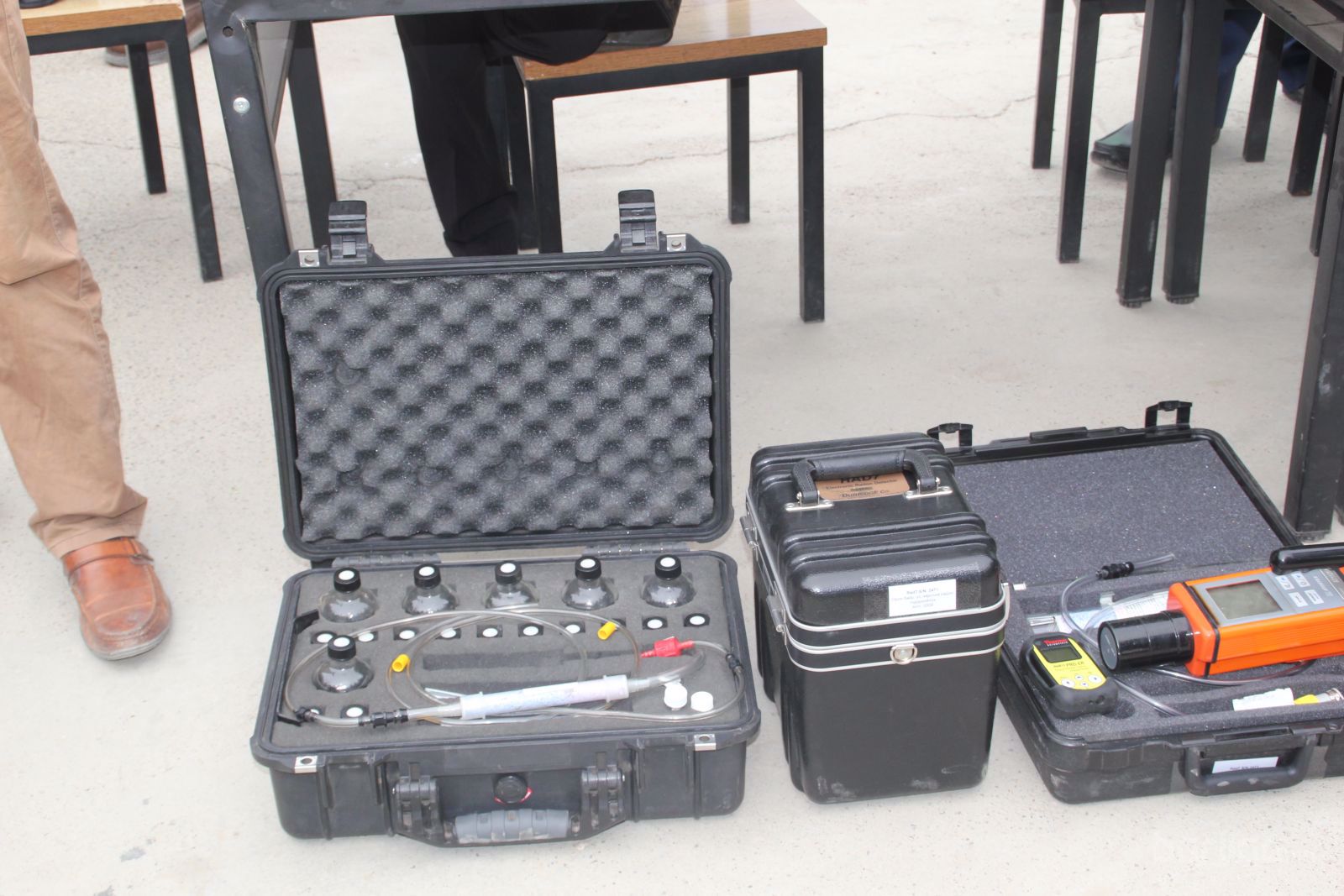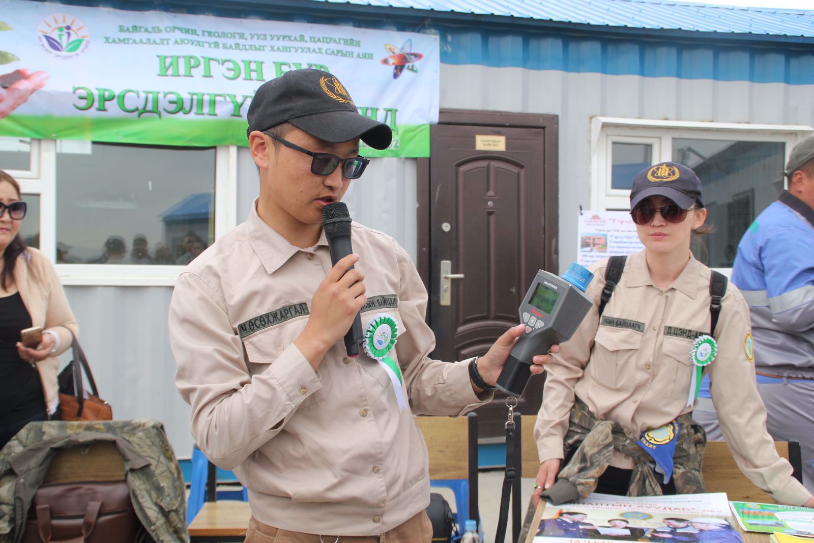 НМХГ-ын улсын байцаагч Ч. Өсөхбаяр / Барилгын материал, түгээмэл тархацтай ашигт малтмалын дээж авч, цацрагийн шинжилгээ хийлгэх түвшний хэмжилт хийдэг төхөөрөмжийн танилцуулгыг хүргэж байна. /