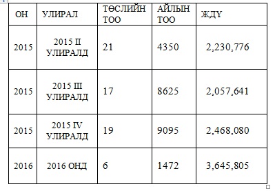 Дээрх хүснэгтээс харахад 2016 онд ашиглалтанд орох 6 төслийн жигнэсэн дундаж үнэ өндөр байгаа нь хотын төв баригдаж байгаа төдийгүй өндөр зэрэглэлд багтаж байгаа юм. Харин 2015 оны гуравдугаар улиралд ашиглалтанд орох төслүүдийн жигнэсэн дундаж үнэ хамгийн бага байгаа нь ихэнх төслүүд нь байршлын хувьд Улаанбаатар хотын С зэрэглэлийн бүсэд баригдаж байгаатай холбоотой.