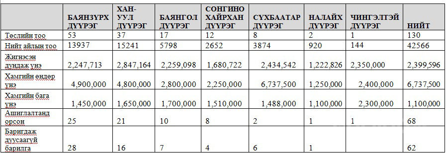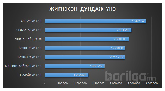 Энэ оны 5 сарын 25-ны өдрийн байдлаар Улаанбаатар хотын Налайх, Сонгино-Хайрхан, Сүхбаатар, Баянгол, Баянзүрх, Хан-Уул, Чингэлтэй . “Барилга.МН” сэтгүүлээс эдгээр орон сууцнуудын үнийн судлагаанд дүгнэлт хийснээ хүргэе.