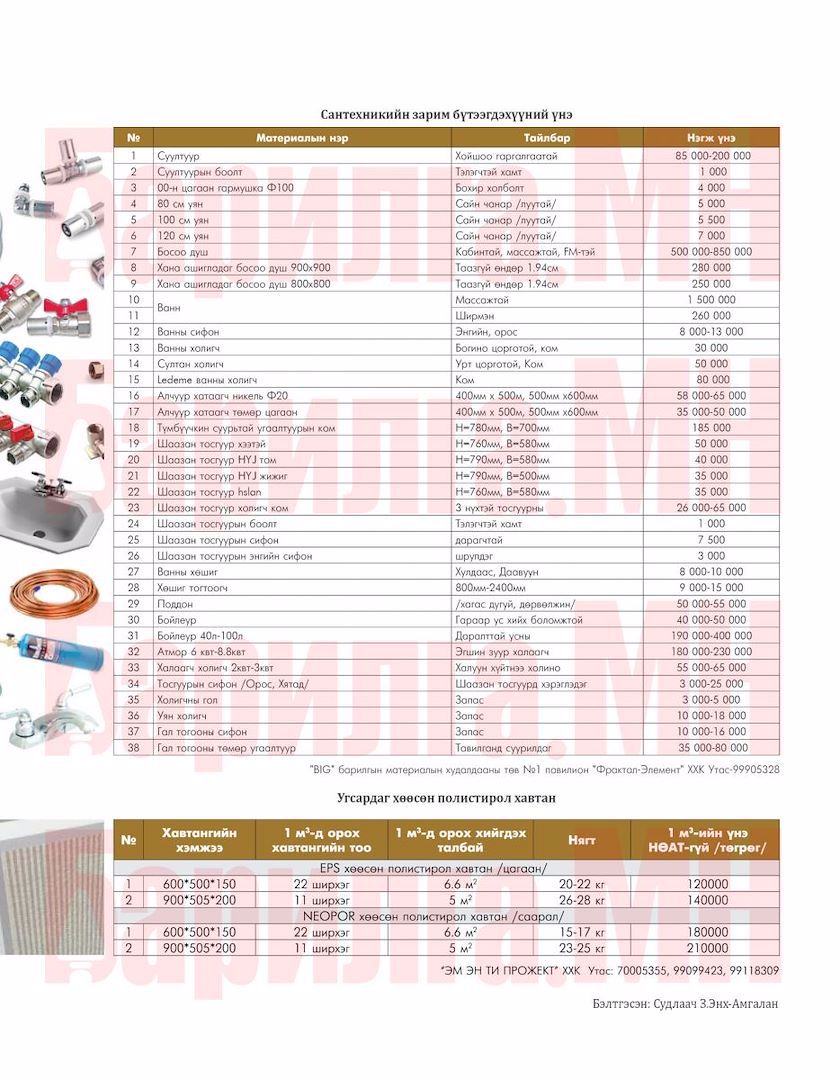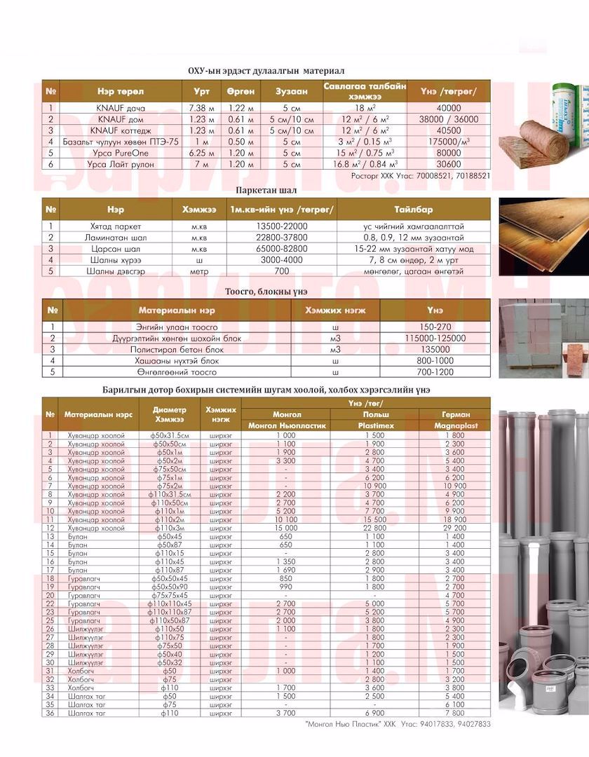 "Барилга.МН" сэтгүүлээс сар бүр хүргэдэг барилгын материалын үнэ ханшийн мэдээллийг уншигч танд хүргэж байна. Илүү дэлгэрэнгүй мэдээлэл авахыг хүсвэл манай сэтгүүлийн 12-р сарын дугаар №67-с үзэх боломжтой. "Барилга.МН" сэтгүүлийг "Номин" болон "Оргил" сүлжээ дэлгүүрийн салбарууд, номын дэлгүүрүүд, сонин сэтгүүл борлуулах цэгүүдээс худалдан аваарай. Доорх үнэ ханш нь 11-р сарын 25-ны өдрийн байдлаар болохыг анхаарна уу.
