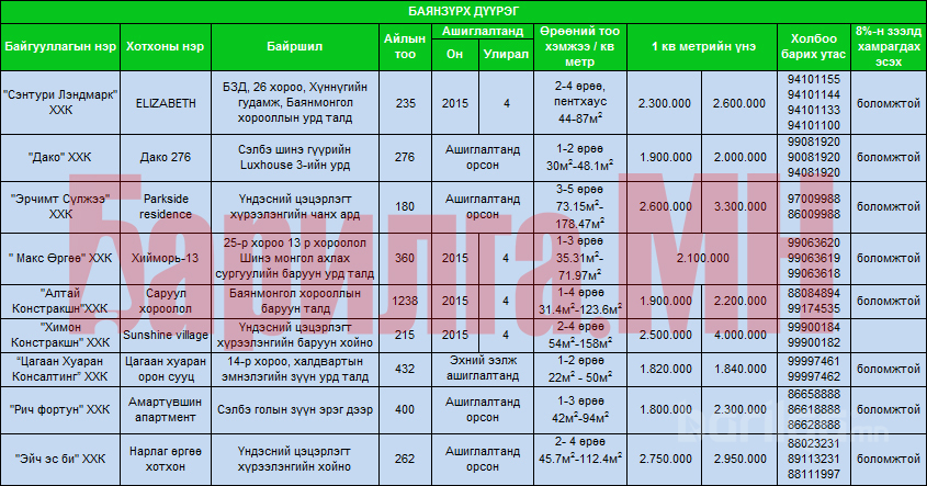 "БАРИЛГА.МН" сэтгүүлийн 11-р сарын шинэ дугаар №66 дээрээс авна уу. Нийт 172 төслийн 50463 айлын шинэ орон сууцны мэдээллийг авах боломжтой.