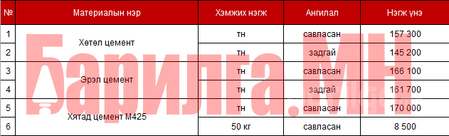 "Барилга.МН" сэтгүүлээс сар бүр хүргэдэг барилгын материалын үнэ ханшийн мэдээллийг уншигч танд хүргэж байна. Илүү дэлгэрэнгүй мэдээлэл авахыг хүсвэл манай сэтгүүлийн 10-р сарын дугаар №65-с үзэх боломжтой. "Барилга.МН" сэтгүүлийг "Номин" болон "Оргил" сүлжээ дэлгүүрийн салбарууд, номын дэлгүүрүүд, сонин сэтгүүл борлуулах цэгүүдээс худалдан аваарай. Доорх үнэ ханш нь 10-р сарын 25-ны өдрийн байдлаар болохыг анхаарна уу.