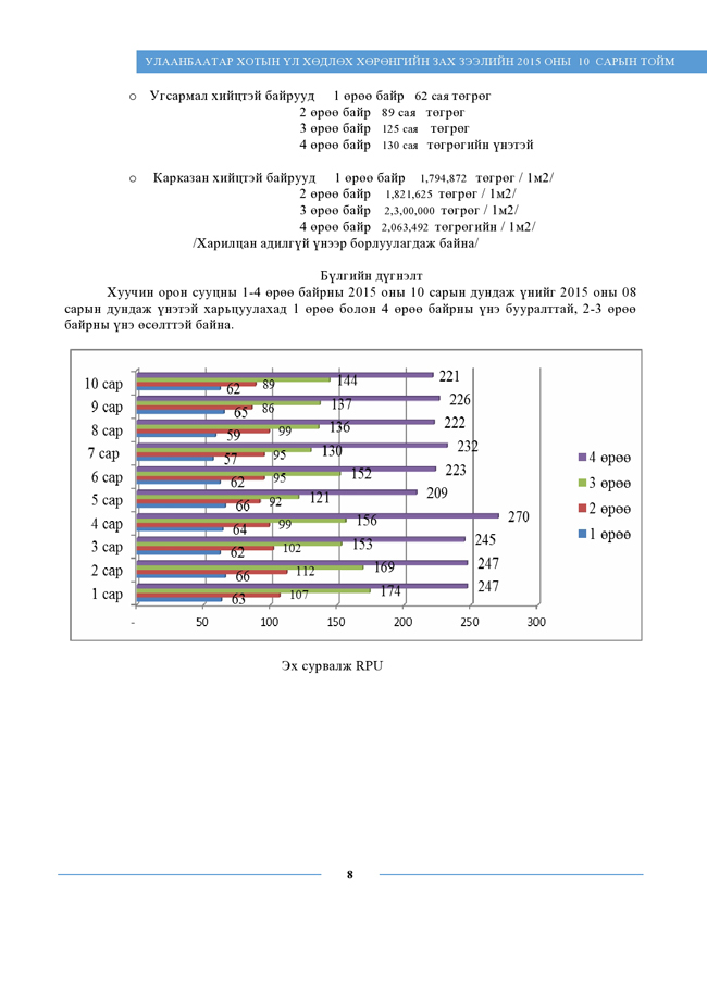 Орон сууцны зээлийн урьдчилгаа 30 хувийг 10 хувь болгон бууруулах шийдвэрийн хэрэгжилтийг хүлээж буй, мөн хуучин орон сууц худалдан авахаар төлөвлөж байгаа иргэдэд зориулан үнэ ханшийн дэлгэрэнгүй мэдээллийг хүргэе. Өнгөрөгч 10-р сарын байдлаар 1-4 өрөө хуучин орон сууцнуудын дундаж үнийг өмнөх сарынхтай харьцуулбал, 1 ба 4 өрөө байрны үнэ бууралттай, 2-3 өрөө байрны үнэ өсөлттэй гарчээ.
