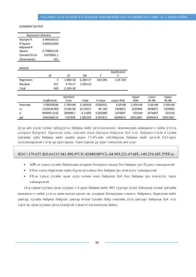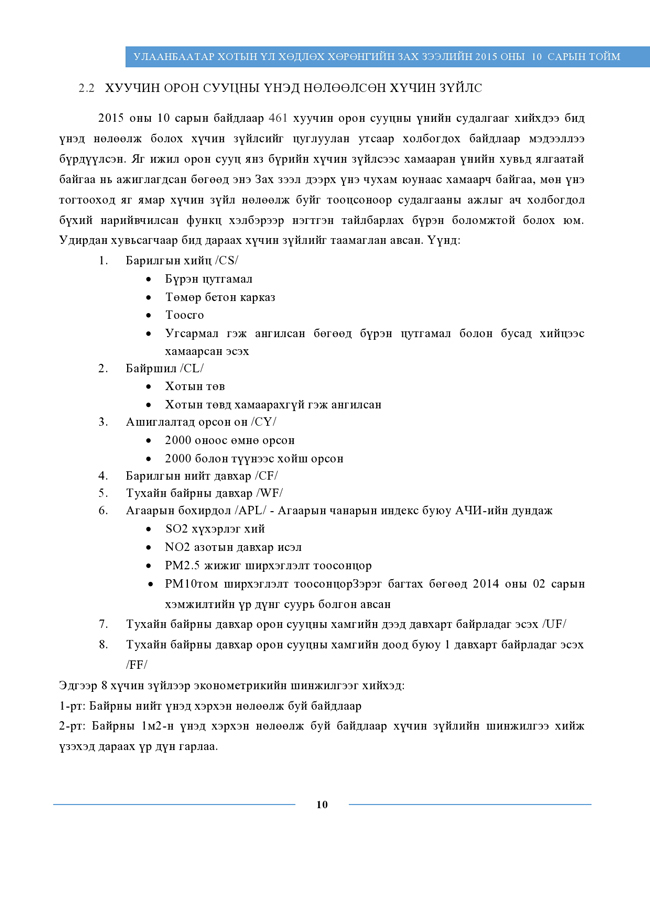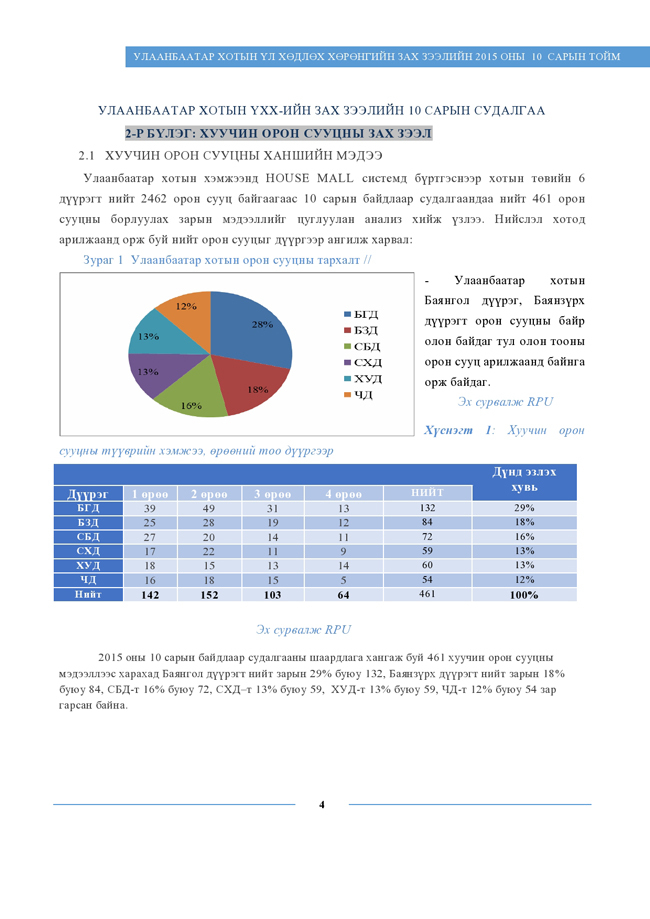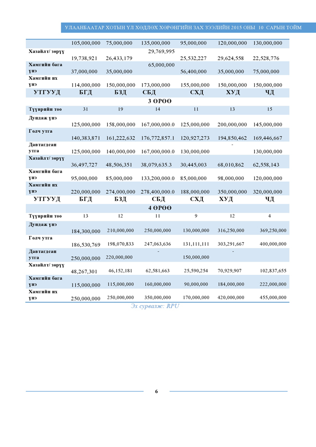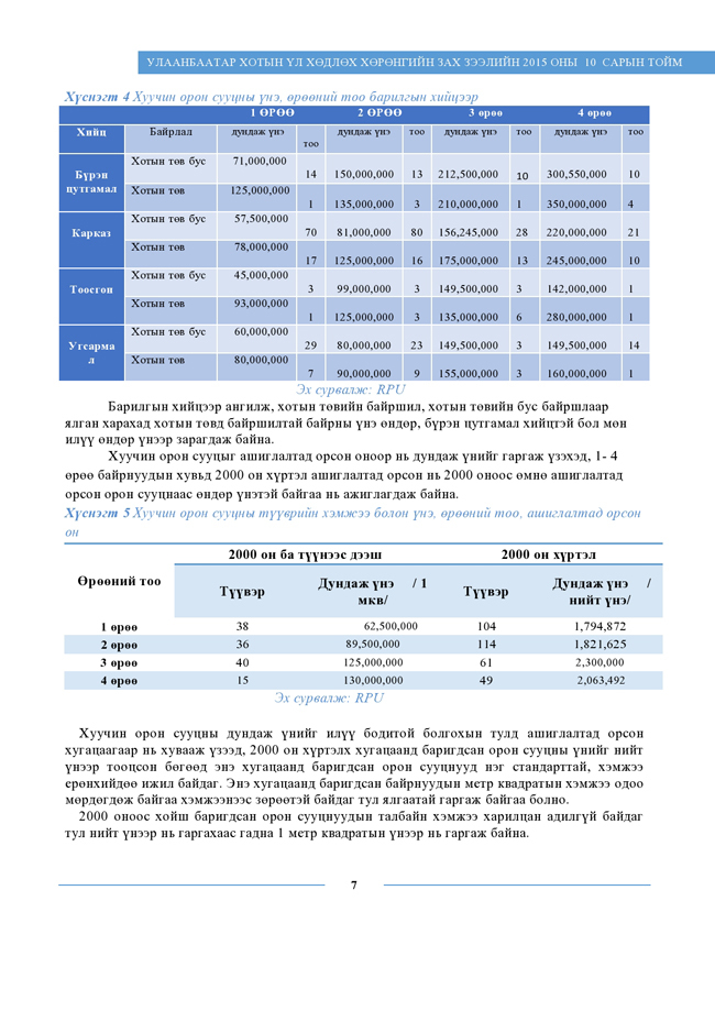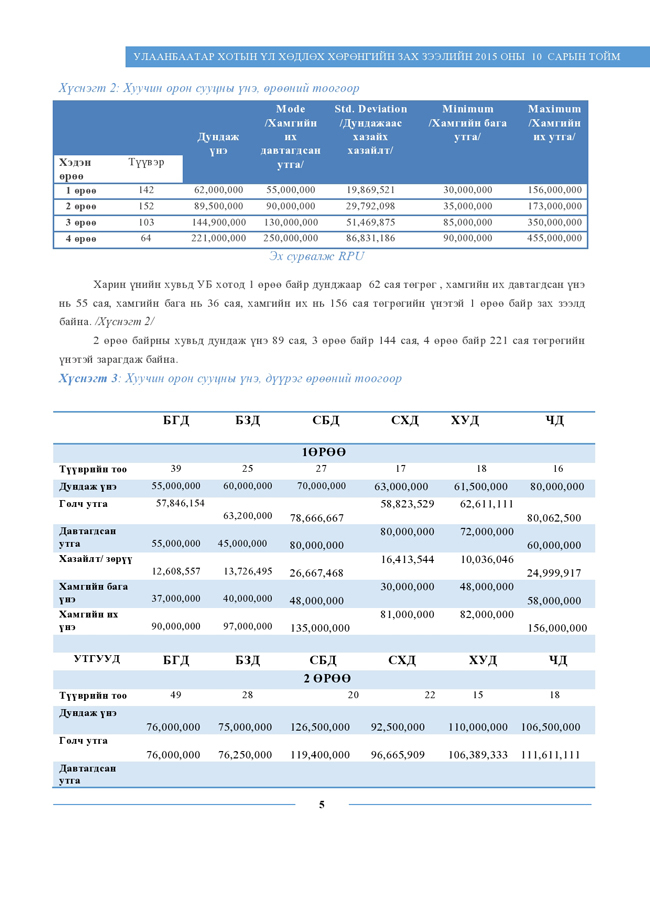 "Real Properties Ulaanbaatar” компанийн судлаачид энэхүү судалгаандаа хуучин орон сууцны 461 борлуулах зарын мэдээллийг цуглуулан, дүн шинжилгээ хийсэн байна. Тус компанийн сар тутам эрхлэн гаргадаг “Улаанбаатар хотын үл хөдлөх хөрөнгийн зах зээлийн 2015 оны 10 сарын тойм”-ын хуучин орон сууцны ханш, түүнд нөлөөлж буй хүчин зүйлсийн талаарх дэлгэрэнгүй мэдээллийг хүлээн авна уу.