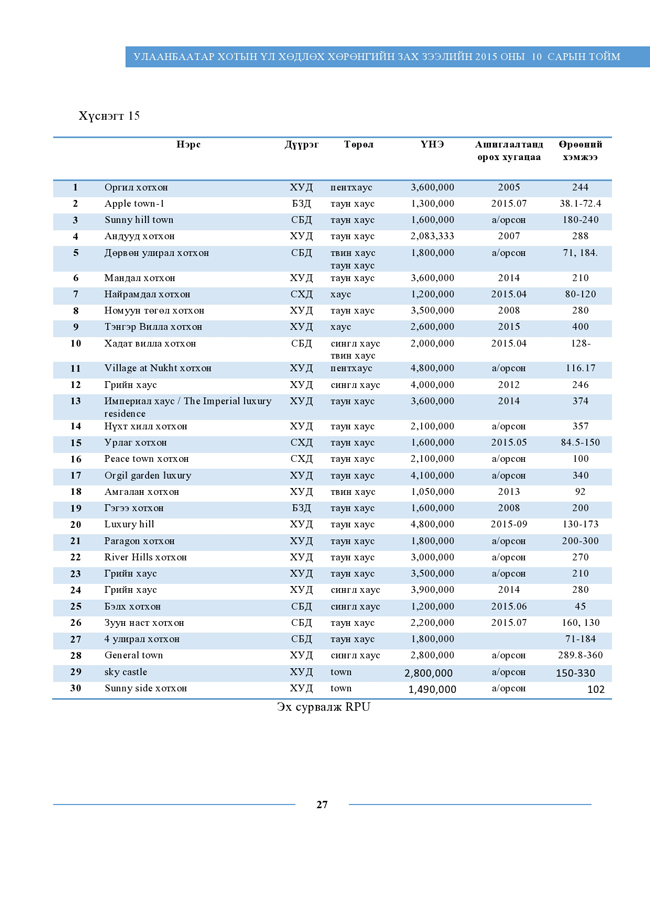 Тус 30 төслийг байршлаар нь авч үзвэл 62 хувь нь Хан-Уул, 21 хувь нь Сүхбаатар, 10 хувь нь Сонгинохайрхан, долоон хувь нь Баянзүрх дүүрэгт тус тус байрлаж байгаа аж. Үнийн дэлгэрэнгүй мэдээллийг “Real Properties Ulaanbaatar” компанийн тойм мэдээллээс хүлээн авна уу.