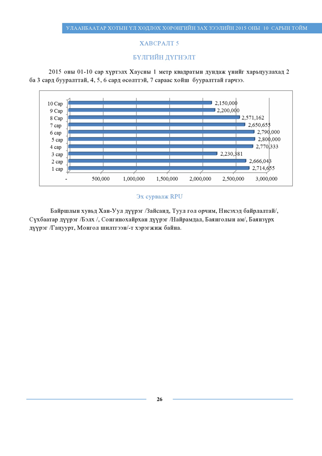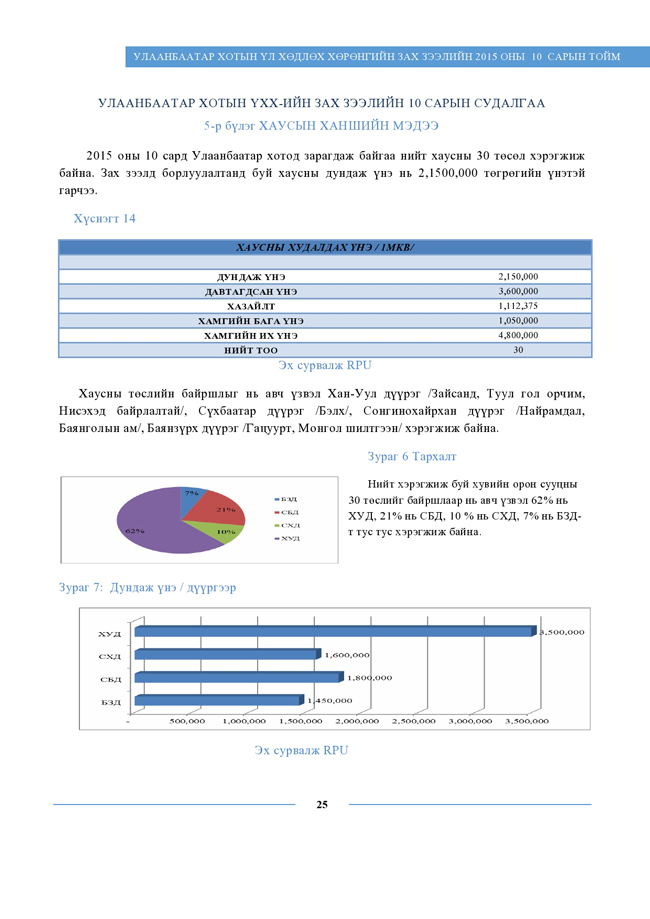 Улаанбаатар хотод баригдаж буй амины орон сууцны ам метрийн дундаж үнэ 2,150,000 төгрөг байгаа аж. Энэ оны 1-10 дугаар сарыг дуусталх дундаж үнийг харьцуулахад 2 ба 3-р сард бууралттай, 4, 5, 6-р сард өсөлттэй, 7-р сараас хойш буурсан үзүүлэлттэй гарсан байна. Энэхүү дундаж үнийн тоймыг нийслэл хотод хэрэгжиж буй амины орон сууцны 30 төсөлд дүн шинжилгээ хийж гаргажээ.