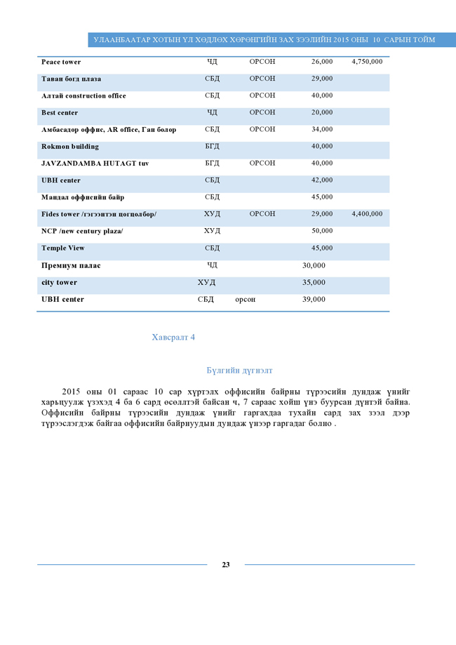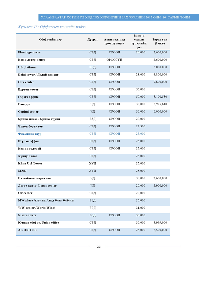 Энэ оны 1-10 дугаар сарыг дуусталх оффисийн түрээсийн дундаж үнийг харьцуулж үзэхэд 4 ба 6-р сард үнэ өсөлттэй байсан ч, 7-р сараас хойш буурсан дүнтэй байгаа аж. Оффисийн байрны түрээсийн болон худалдах үнийн ялгаатай байдал нь тухайн оффисийн барилгын байрлал, зэрэглэл зэргээс хамааран харилцан адилгүй байдаг нь үнийн дэлгэрэнгүй хүснэгтээс харагдаж байна.