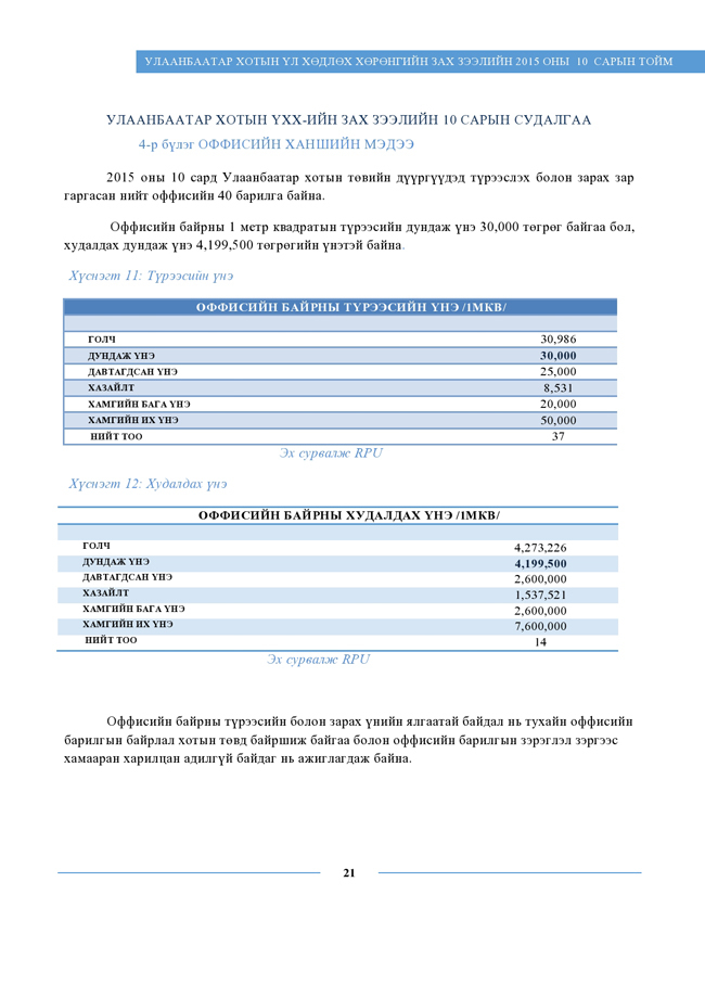 Оффисийн талбайн 1 ам метрийн түрээсийн дундаж үнэ 30,00 төгрөг, худалдах дундаж үнэ 4,199,500 төгрөг байна. Энэхүү үнийн харьцуулсан судалгааг “Real Properties Ulaanbaatar” компани Улаанбаатар хотын төвийн дүүргүүдэд түрээслэх болон худалдах зар гаргасан оффисийн 40 байрны мэдээлэлд дүгнэлт хийн гаргажээ.