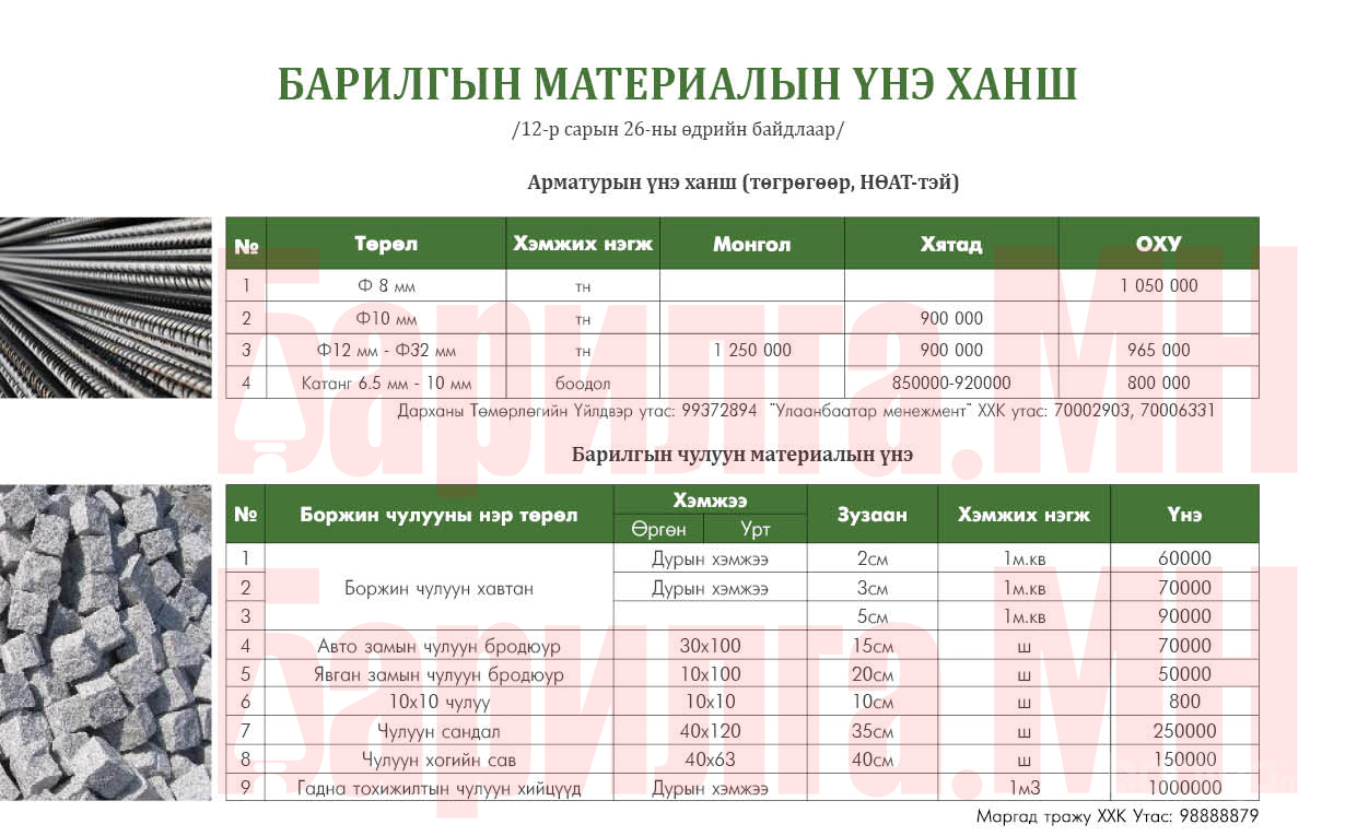 "Барилга.МН" сэтгүүлээс сар бүр хүргэдэг барилгын материалын үнэ ханшийн мэдээллийг уншигч танд хүргэж байна. Илүү дэлгэрэнгүй мэдээлэл авахыг хүсвэл манай сэтгүүлийн 1-р сарын дугаар №68-с үзэх боломжтой. "Барилга.МН" сэтгүүлийг "Номин" болон "Оргил" сүлжээ дэлгүүрийн салбарууд, номын дэлгүүрүүд, сонин сэтгүүл борлуулах цэгүүдээс худалдан аваарай. Доорх үнэ ханш нь 12-р сарын 25-ны өдрийн байдлаар болохыг анхаарна уу.