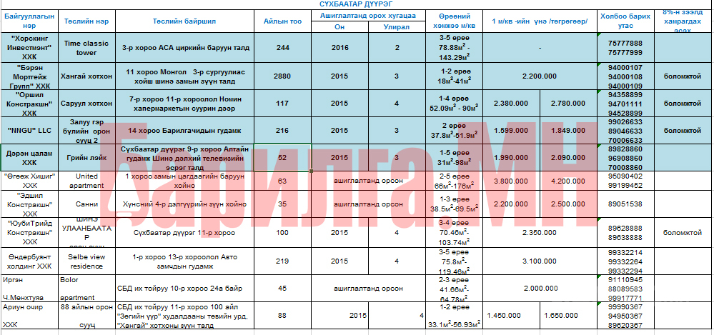 Та бусад дүүргийн шинэ орон сууцны үнэ ханшийн мэдээллийг "БАРИЛГА.МН" сэтгүүлийн 9-р сарын шинэ дугаараас үзнэ үү. "Барилга.МН" сэтгүүлийг "Номин" болон "Оргил" сүлжээ дэлгүүрийн салбарууд, номын дэлгүүрүүд, сонин сэтгүүл борлуулах цэгүүдээс худалдан аваарай. Тус үнэ ханш нь 8-р сарын 25-ны өдрийн байдлаар болохыг анхаарна уу.