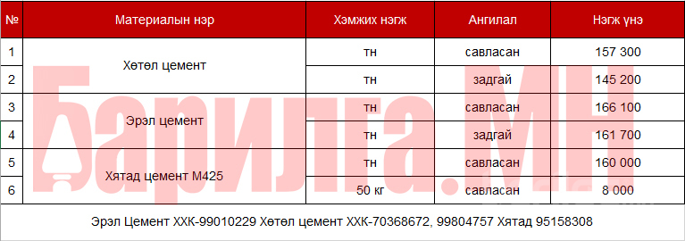 "Барилга.МН" сэтгүүлээс сар бүр хүргэдэг барилгын материалын үнэ ханшийн мэдээллийг уншигч танд хүргэж байна. Илүү дэлгэрэнгүй мэдээлэл авахыг хүсвэл манай сэтгүүлийн 9-р сарын дугаараас танилцана уу. "Барилга.МН" сэтгүүлийг "Номин" болон "Оргил" сүлжээ дэлгүүрийн салбарууд, номын дэлгүүрүүд, сонин сэтгүүл борлуулах цэгүүдээс худалдан аваарай. Доорх үнэ ханш нь 8-р сарын 31-ны өдрийн байдлаар болохыг анхаарна уу.