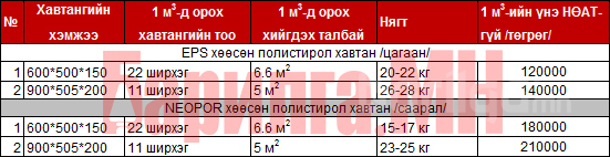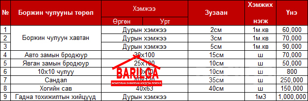Барилгын чулуун материалын үнэ (төгрөгөөр)
