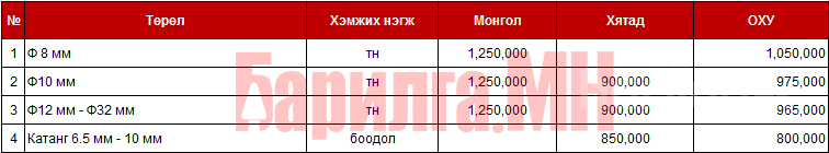 Арматурын үнэ ханш (төгрөгөөр, НӨАТ-тэй)