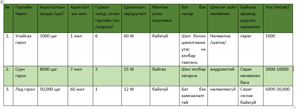 “Лед гэрэл нь байгалийн гэрэлтэй ижил гэрэл ялгаруулдаг учир дэлхийд “гэрэлт цох” хэмээгддэг. Зардлын хувьд гурван жилд улайсах гэрэл 120 орчим мянга, сүүн гэрэл 52 мянга, лед гэрэл 16 мянган төгрөгийн зардал гаргадаг аж. “