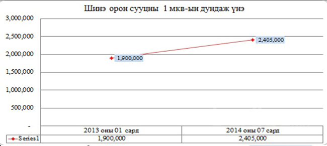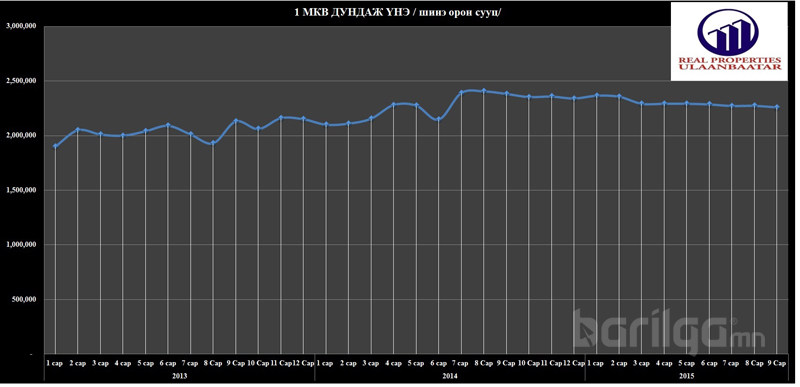 2013 оны 01 сард 1 ам метр нь 1,900,000 төгрөгийн дундаж үнэтэй байсан бол 2013 оны 06 сард 8 хувийн ипотекийн зээл олгогдож эхэлснээс хойш огцом өсч, 1 жил 8 сарын дараа 2014 оны 07 сард 2,405,000 төгрөгийн үнэтэй болж, 2013 оны 01 сартай харьцуулахад 1 ам метрийн үнэ 550,000 төгрөгөөс өссөн дүнтэй гарчээ. Харин 2015 оны 09 сарын үнийг өмнөх оны мөн үетэй харьцуулахад 1 ам метрийн үнэ 123,000 төгрөгийн бууралттай байна.