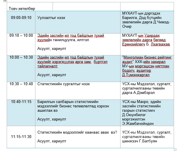 Мөн уулзалт ярилцлагын дараа Үндэсний Статистикийн хорооноос бизнесийн байгууллагын бодлого, төлөвлөлт, дүн шинжилгээнд статистикийн үнэн бодит мэдээллийг ашиглах зайлшгүй шаардлага, статистикийн мэдээллийг хэрэглэх арга, техник, статистикийн мэдээллийг тархаах арга, хэлбэр, мэдээллийг олж авах сувгийн талаар нэгдсэн ойлголт, мэдлэг өгч, статистикийн мэдээллийн практик хэрэглээг нэмэгдүүлэх тухай мэдээлэл өгнө.