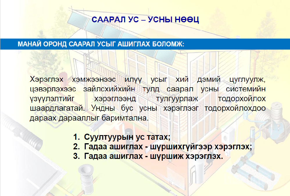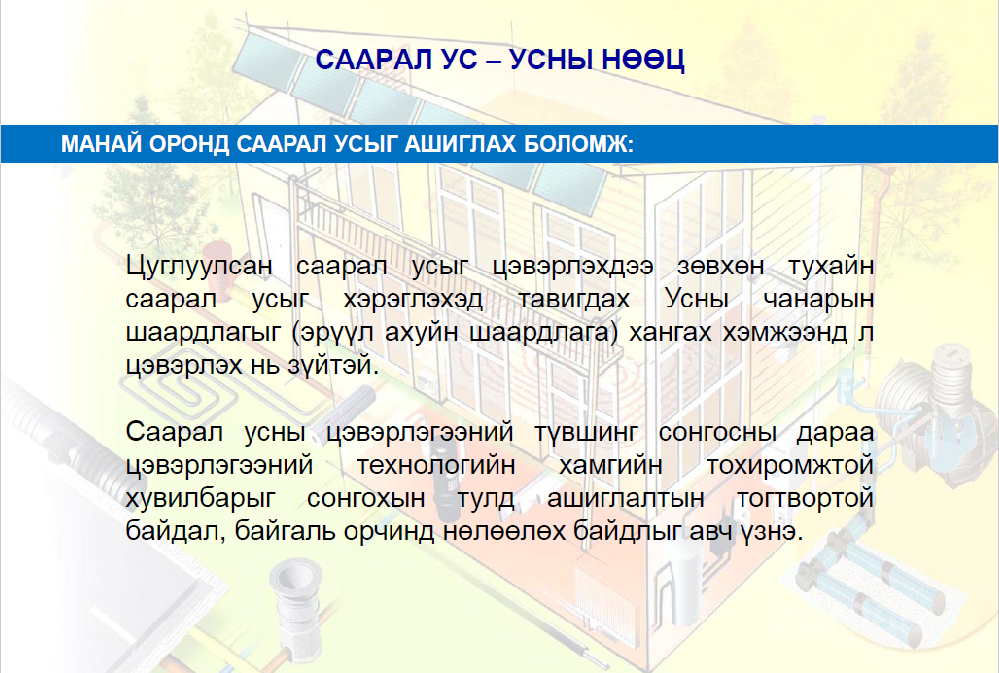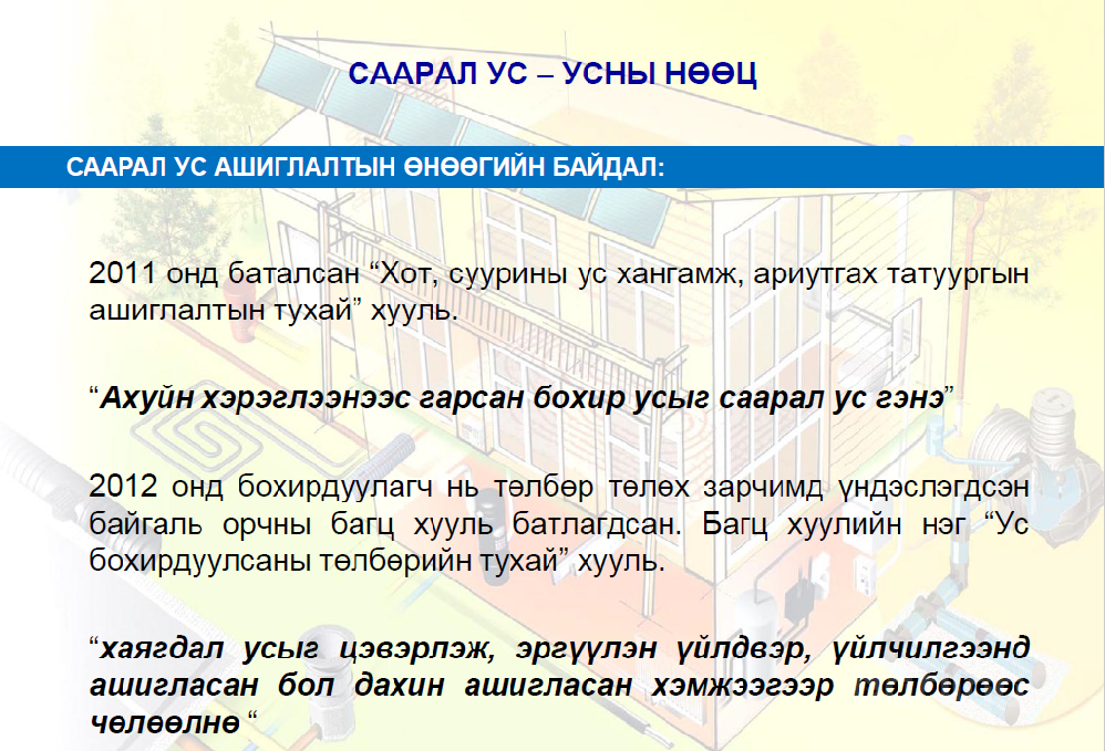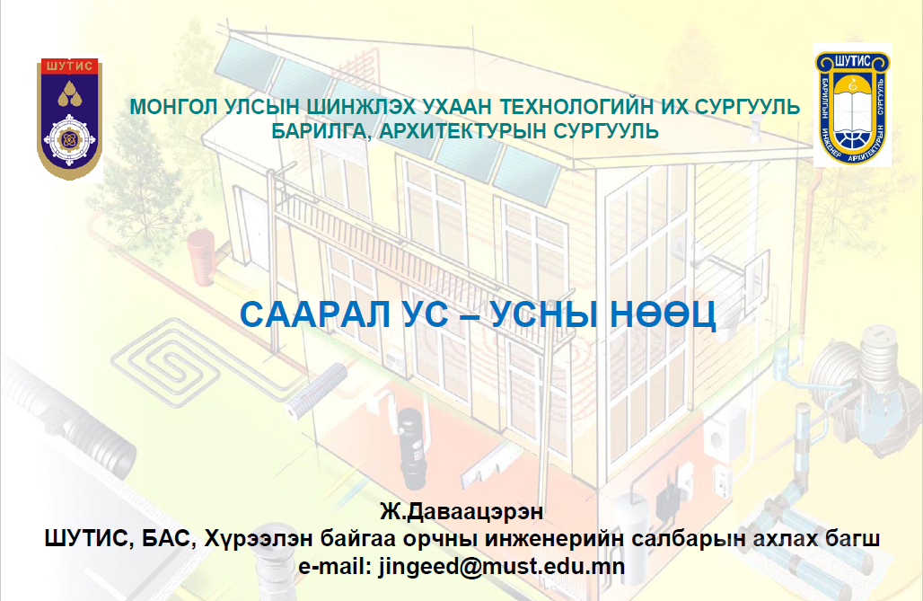 Барилгын Зөвлөгөө Мэдээллийн Төв, Каритас Чех Репаблик Олон Улсын байгууллага хамтран “Монголд ногоон барилга баригдах боломжтой ба шийдэл” сэдэвт семинарыг 10 дугаар сарын 2-нд зохион байгуулсан билээ. Тус семинар дээр ШУТИС-ийн БАС-ийн Хүрээлэн байгаа орчны инженерийн салбарын ахлах багш Ж.Даваацэрэнгийн тавьсан "Саарал ус-усны нөөц" хэмээх илтгэлийг зураг хэлбэрээр хүргэж байна.