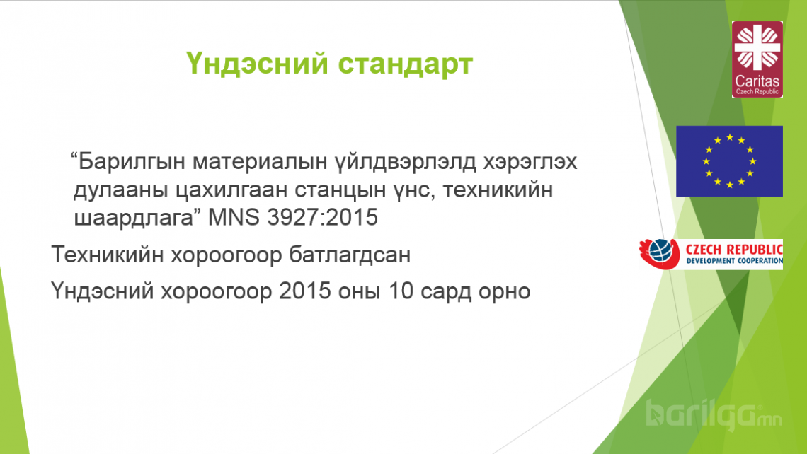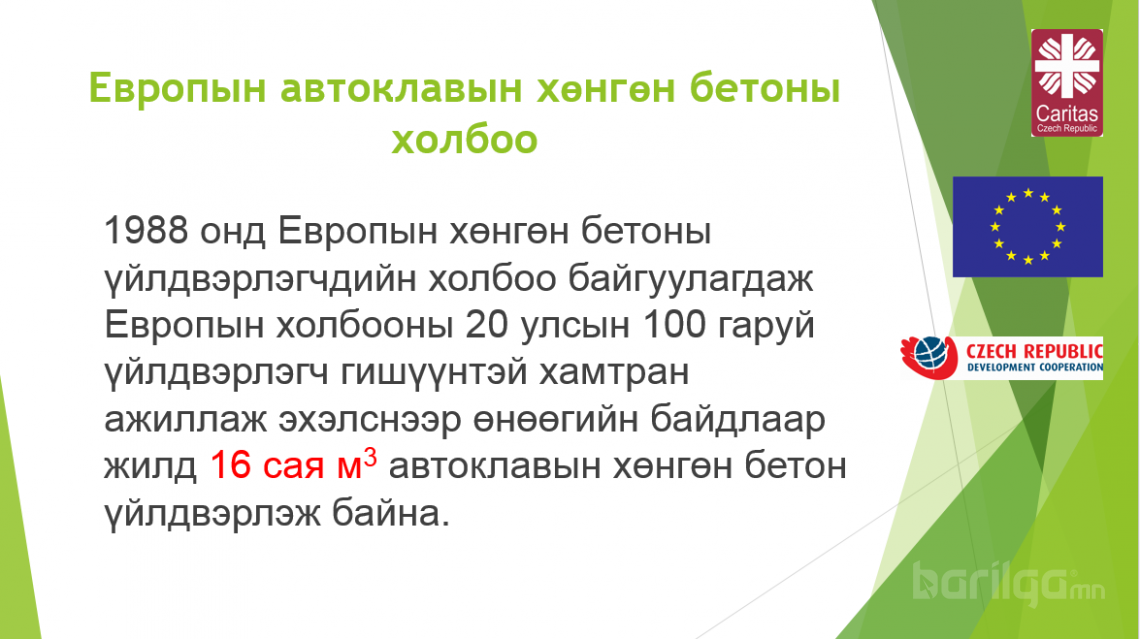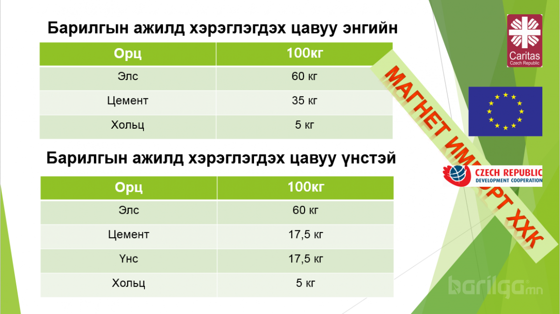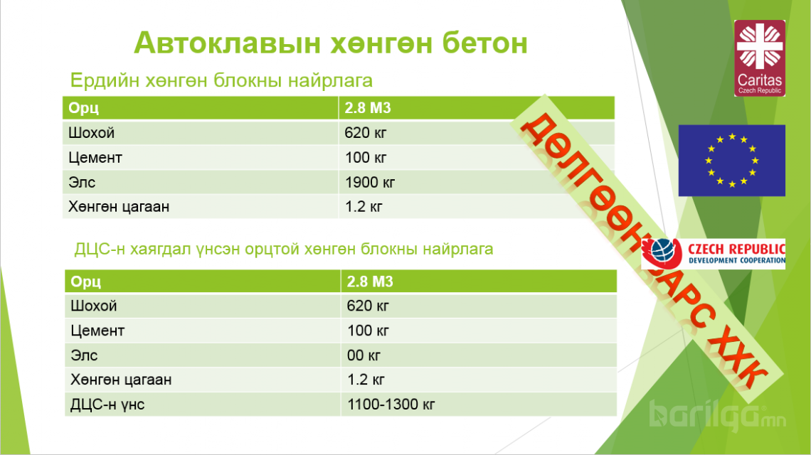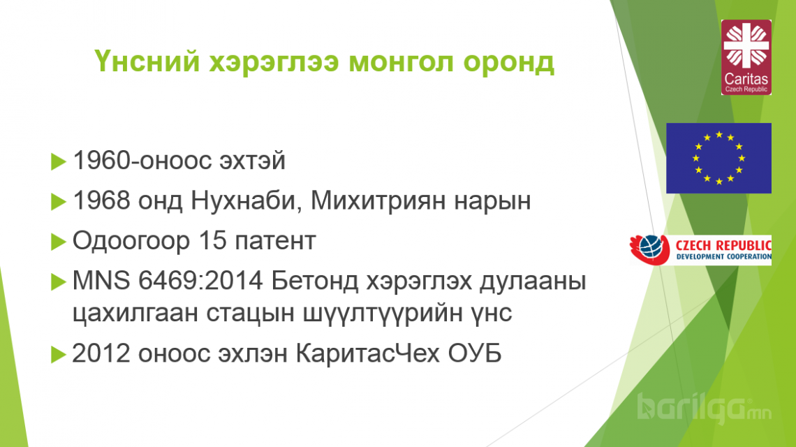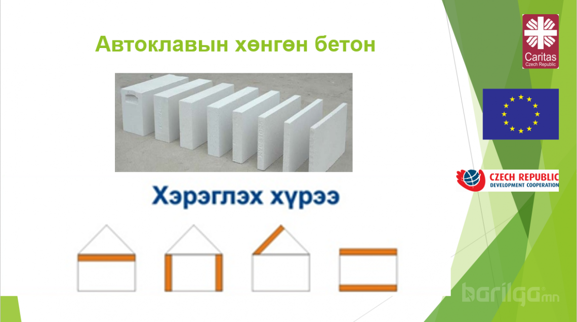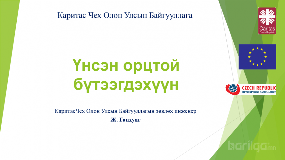 Барилгын Зөвлөгөө Мэдээллийн Төв, Каритас Чех Репаблик Олон Улсын байгууллага хамтран “Монголд ногоон барилга баригдах боломжтой ба шийдэл” сэдэвт семинарыг 10 дугаар сарын 2-нд зохион байгуулсан билээ. Тус семинар дээр Каритас Чех Олон Улсын байгуулагын зөвлөх инженер Ж.Ганхуягын тавьсан "Үндсэн орцтой бүтээгдэхүүн" хэмээх илтгэлийг зураг хэлбэрээр хүргэж байна.