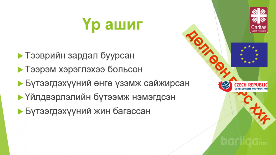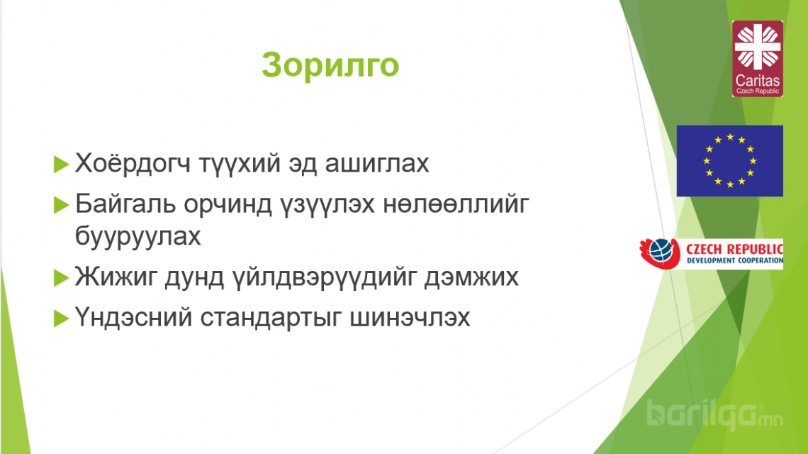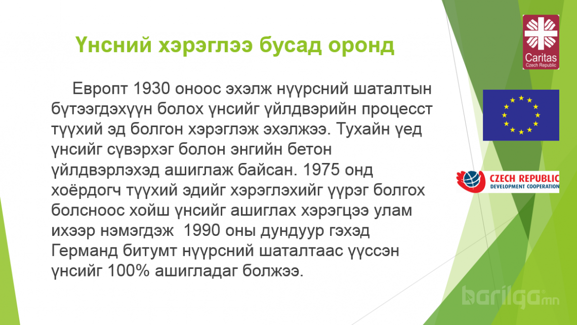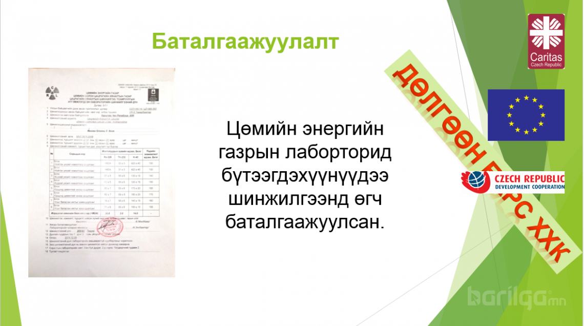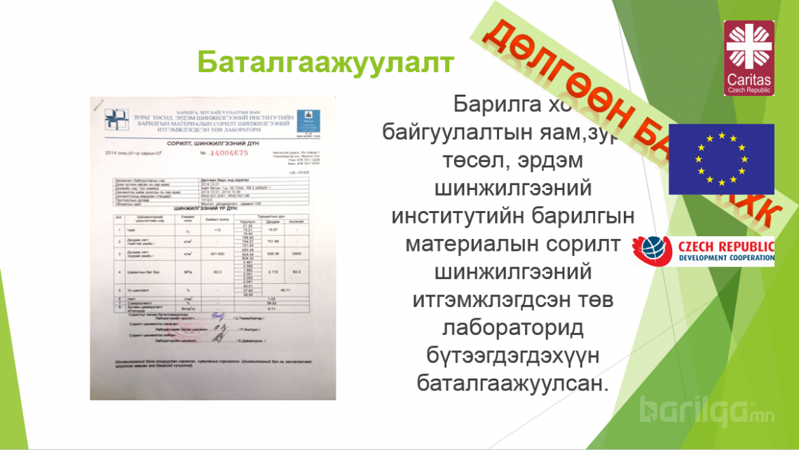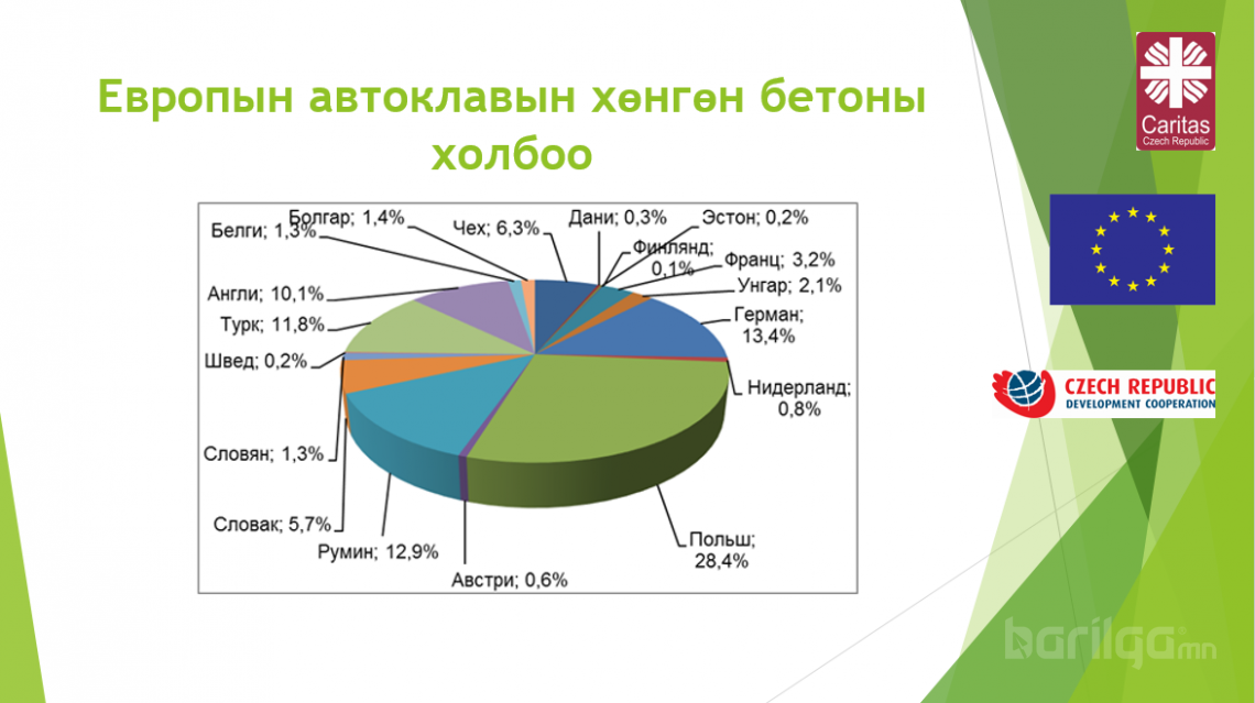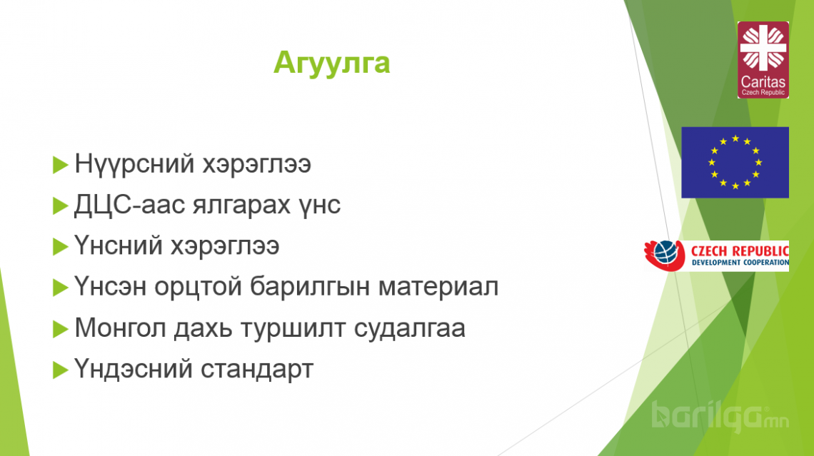 Барилгын Зөвлөгөө Мэдээллийн Төв, Каритас Чех Репаблик Олон Улсын байгууллага хамтран “Монголд ногоон барилга баригдах боломжтой ба шийдэл” сэдэвт семинарыг 10 дугаар сарын 2-нд зохион байгуулсан билээ. Тус семинар дээр Каритас Чех Олон Улсын байгуулагын зөвлөх инженер Ж.Ганхуягын тавьсан "Үндсэн орцтой бүтээгдэхүүн" хэмээх илтгэлийг зураг хэлбэрээр хүргэж байна.