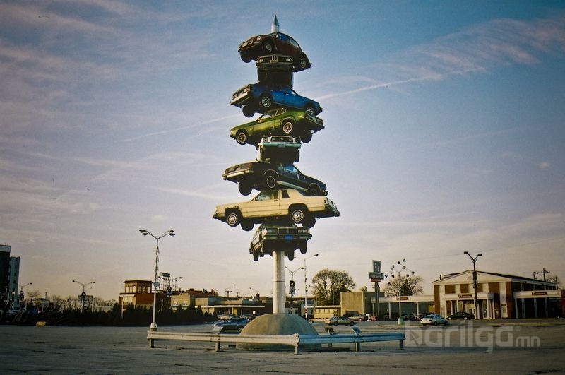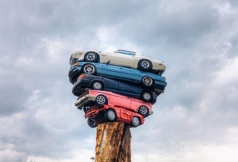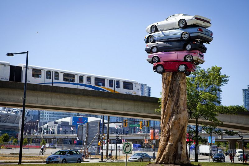 Ванкувер хотын “Quebec” гудамжны замын уулзвар дахь модны хожуул дээр 10 метрийн өндөр, 11.340 кг жинтэй овоолсон 5 машин бүхий баримал байрладаг байна. Тус баримлыг 2015 онд Ванкуверийн зураач Маркус Вокут "Тrans Am Totem" хэмээх нэртэй энэхүү бүтээлээ танилцуулсан бөгөөд BMW, Honda Civic, Volkswagen Golf Mk1, Cabriolet мөн 1981 Pontiac Trans Am маркийн машиныг оргилд нь байрлуулсан байна. Эдгээр машиныг орон нутгийн төмрийн хаягдал цуглуулгаас хандивласан ажээ. Мөн Берлин хотын Иллинойс мужид үүнтэй ижил Volkswagen болон BMW маркийн 8 машинаас бүрдсэн "Шпиндели" хэмээх уран баримал байдаг аж.