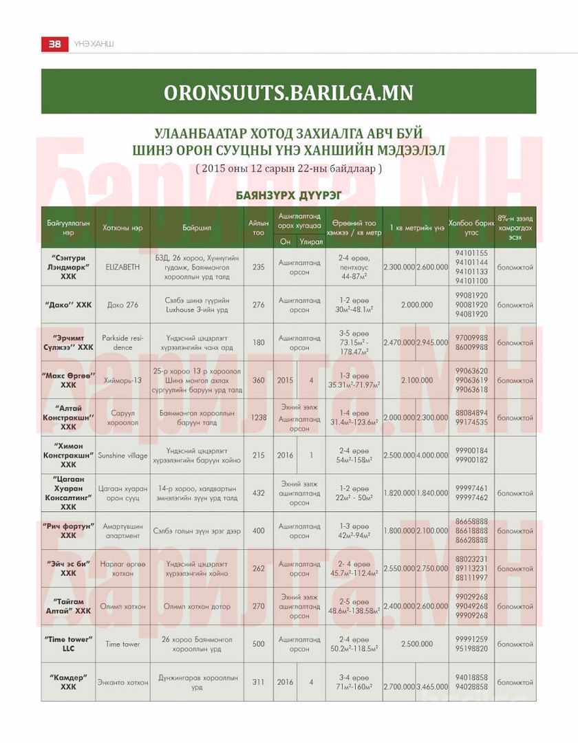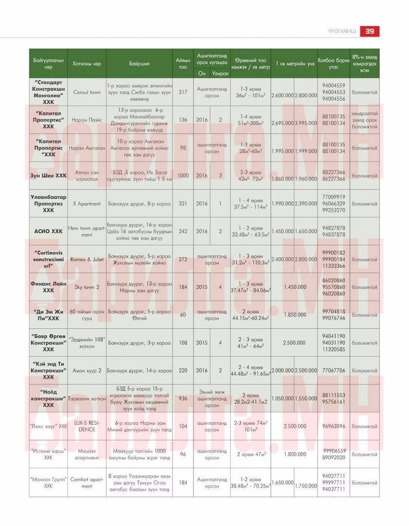 "БАРИЛГА.МН" сэтгүүлийн 1-р сарын шинэ дугаар №68 дээрээс авна уу. Нийт 165 төслийн 48567 айлын шинэ орон сууцны мэдээллийг авах боломжтой.