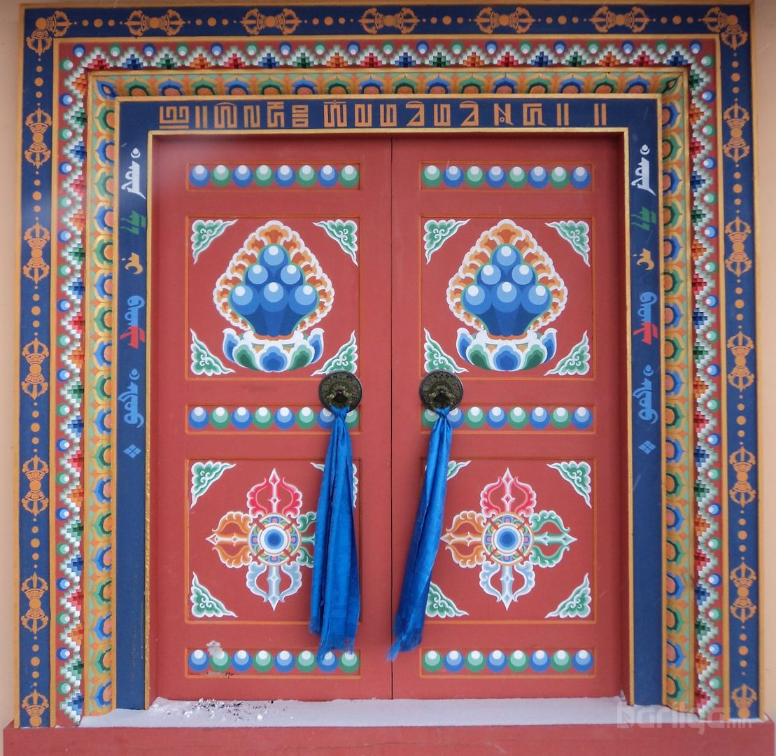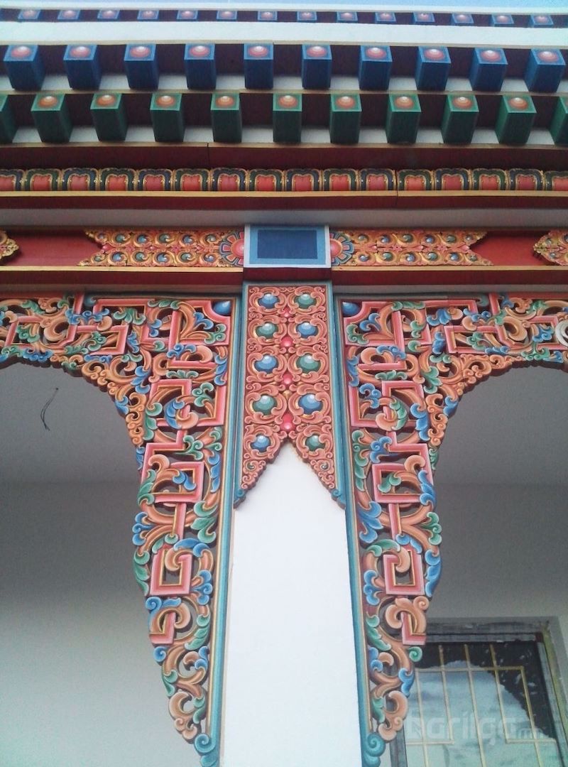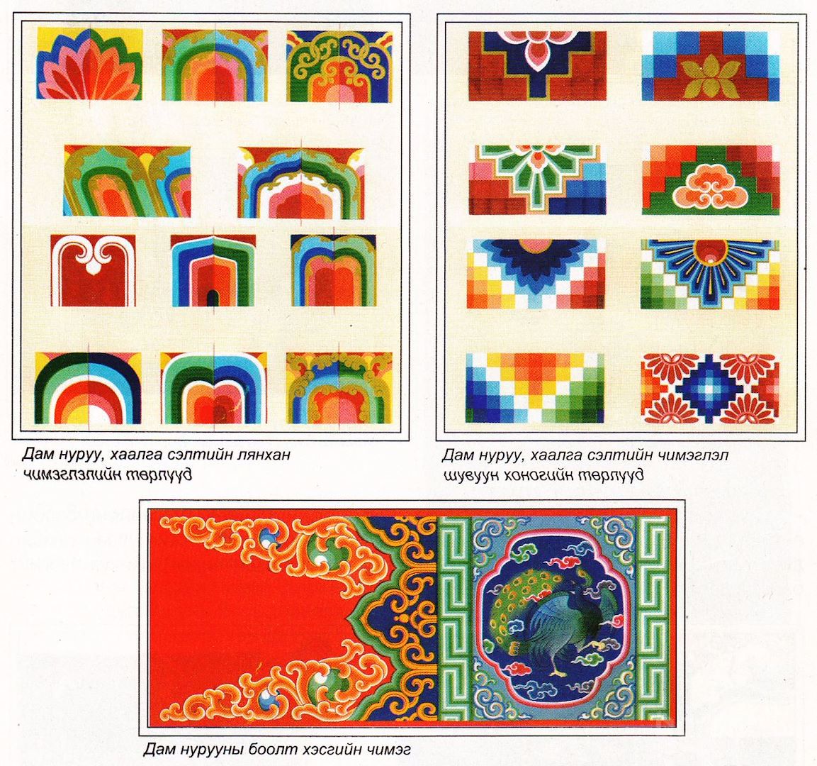 - Үсгийн язгуур лугаа барилдсан хээ угалз гэх мэтээр тухайн сүмийн язгуур лугаа зохилдуулан өнгө уусгах, хүүлэн дагнах, бичиж дагнах, шавшин дагнах, сийлэх, сүмбэрлэх гэх мэт аргаар алт, мөнгө есөн эрдэнэ, торго дурдан ашиглан чимэглэдэг байна. Мөн оройн чимэг болох төрөл бүрийн ганжир, жанцан дуаз, тэрсүүдийг номхтгосон хар туг, номын хүрдэн буюу хорол, бодь гөрөөс гэх мэт шашны уламжлалт билэг дэмбэрэл, ёс жаягийг агуулна.
