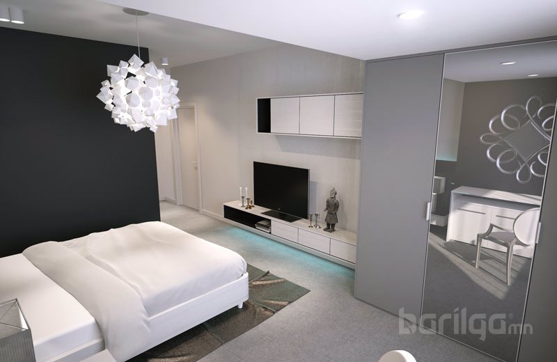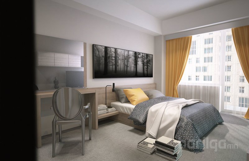 Мөн л “минимал” хэв шинжийг агуулсан орчин үеийн төгс шийдэл болсон. Гэрэлтүүлэг, хурц өнгийн хөшиг зэрэг нь өрөөг гэгээлэг болгож, сонирхолтой загварлаг харагдуулах үүргийг гүйцэтгэнэ.