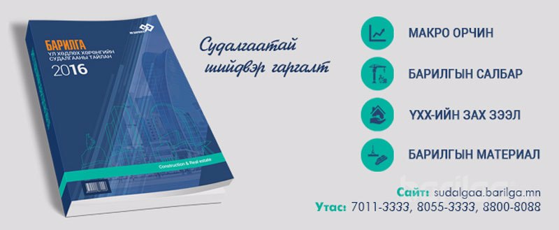 Монгол Улсад шинэ үеийн барилгын салбар үүсч хөгжсөний 90 жилийн ойг тохиолдуулан “Барилга, үл хөдлөх хөрөнгийн судалгаа 2016” тайланг анх удаа салбарын удирдах ажилтнууд, бизнес эрхлэгчид, хөрөнгө оруулагчдад зориулан гаргалаа. Тайланд макро эдийн засаг, хот төлөвлөлт, ипотекийн зээл, хөрөнгө оруулалт болон салбарын гүйцэтгэгч, үйлдвэрлэгч, импортлогч ААН, ажиллах хүчин, ҮХХ-ийн зах зээлийн судалгаа зэргийг цогцоор нь авч үзсэн юм.