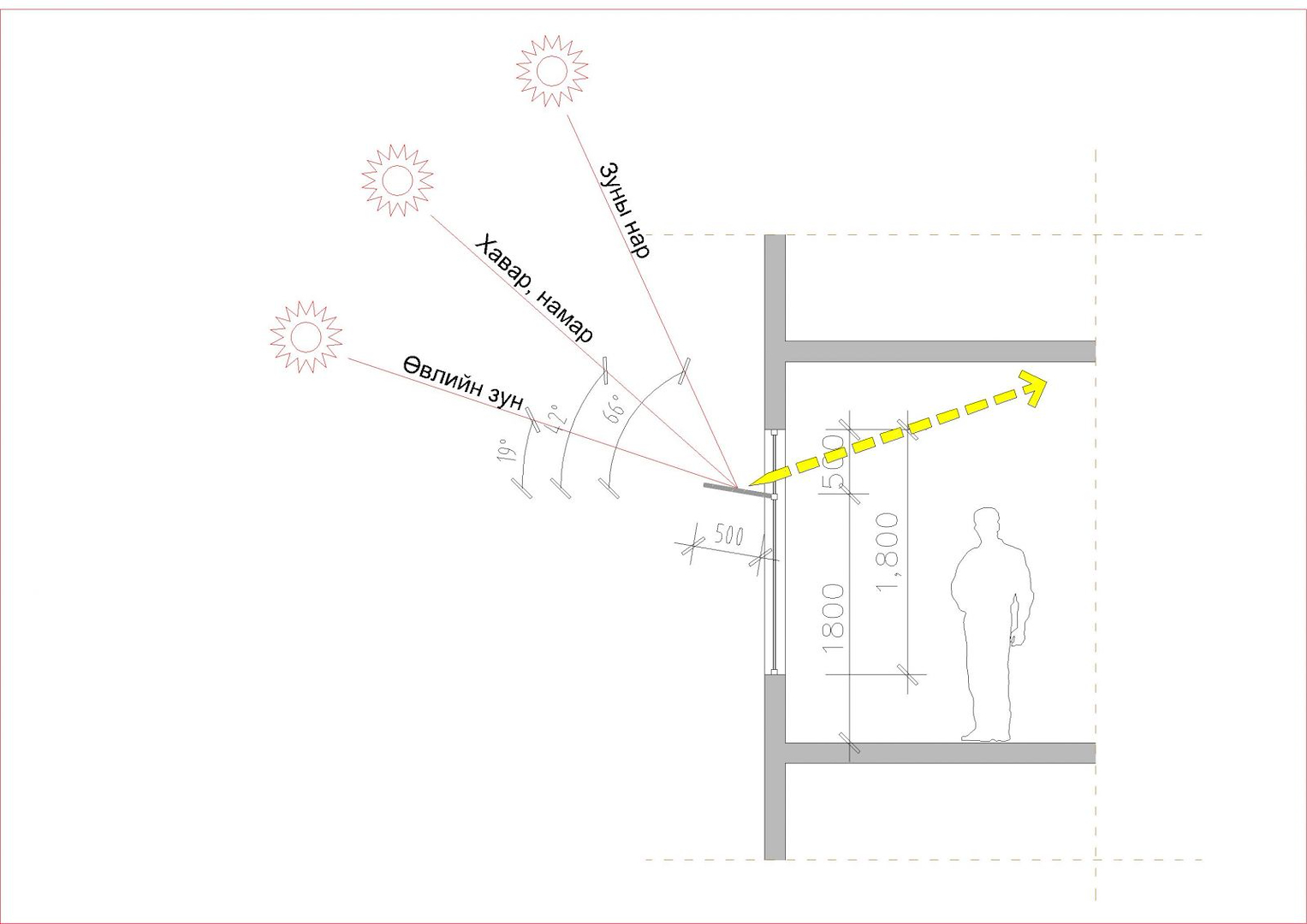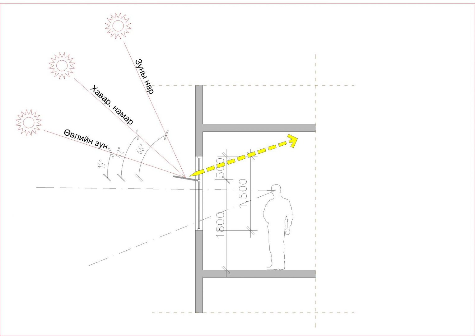 - Байгалын гэрэлтүүлгийн системийг төлөвлөлтөнд тусгахдаа толин ойлтын аргыг ашиглан нэмэлт байгалийн гэрэл нэвтрүүлэх замаар сууцны өрөө тасалгааны норматив гүнийг 2.5 м хүртэл нэмэгдүүлэх боломжтой.