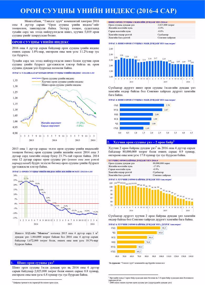Сар бүр тогтмол гардаг Орон сууцны үнийн индексийг өнөөдөр танилцууллаа. Монголбанкны захиалгаар “Тэнхлэг зууч” компанийн гүйцэтгэдэг тус судалгаагаар өнгөрсөн 4-р сард Орон сууцны үнийн ерөнхий индекс 3.5 хувьтай гарлаа. Энэ нь өмнөх сараас -1.0 хувиар буурсан үзүүлэлт юм. Мөн оны эхэн үетэй харьцуулахад -1.9 хувь, өнгөрсөн оны мөн үетэй буюу 2015 оны 4-р сарын үр дүнтэй харьцуулахад -11.2 хувиар буурчээ. Харин үнийн индексийн үзүүлэлтийг шинэ орон сууц, хуучин орон сууцаар ангилж үзвэл: