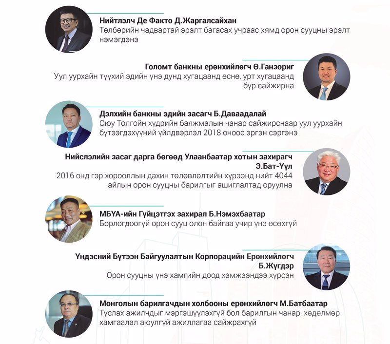 Түүнчлэн эдийн засаг, бизнес болоод барилгын салбарт олон арван жил ажилласан туршлагатай 20 гаруй эдийн засагчид, бизнес эрхлэгчид, МУ-ын Зөвлөх инженерүүд, барилгын материал үйлдвэрлэгчид, холбогдох Төрийн болоод төрийн бус мэргэжлийн байгууллагын удирдлагуудын байр суурь, дүгнэлт, зөвлөмж, дэвшүүлж буй таамаглалуудыг нэгтгэн хүргэсэн нь энэхүү тайлангийн зүйрлэмгүй үнэ цэнийн илэрхийлэл юм.