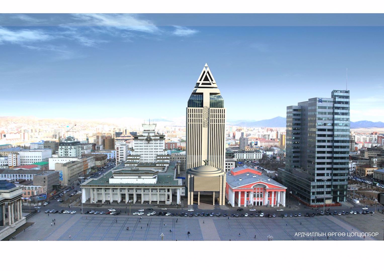 Уг нь их том талбайтай. Захиалагч бол /Худалдаа хөгжлийн банкны ТУЗ-ын дарга Д.Эрдэнэбилэг/ тэр талбайг дүүргэсэн архитектур гаргахыг даалгасан. Барилга дундаа том цөмтэй, найман цахилгаан шат байгаа. Төмөр бетоноор хамгийн өндөр хийж болох хэмжээ /14 давхар/-ээр нь тултал нь хийсэн. Лед дэлгэцийг нь сүүлд гялгар хана байлгаж байхаар гээд захиалагчийн хүсэлтээр сүүлд хийлгэсэн.