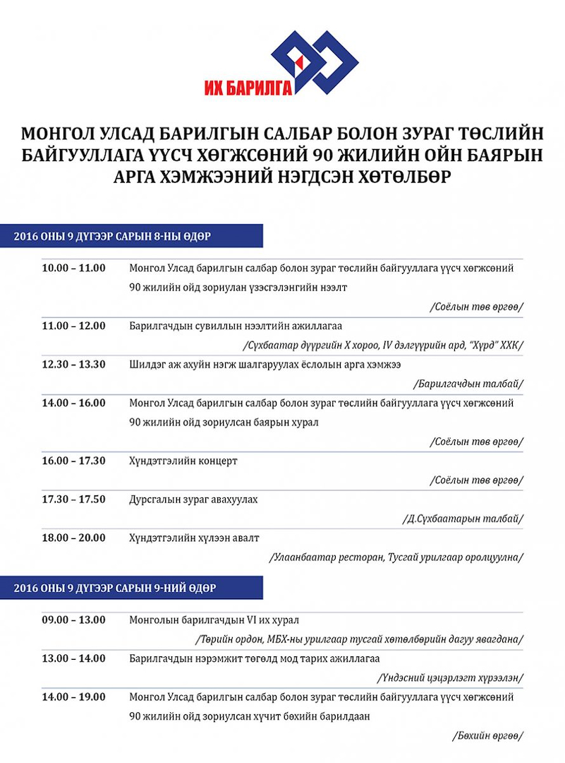 Монгол Улсад барилгын салбар болон зураг төслийн байгууллага үүсч хөгжсөний 90 жилийн ойн баярын арга хэмжээний нэгдсэн хөтөлбөр