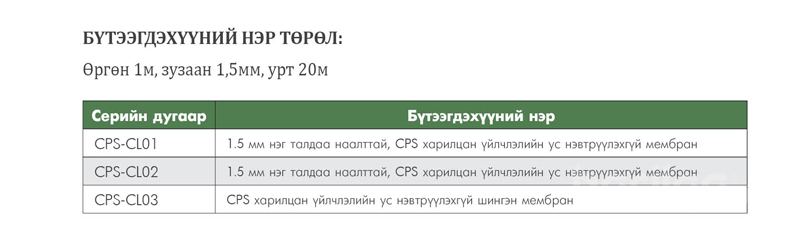 Энэхүү “CPS-CL” маркийн бүтээгдэхүүн нь төмөр бетон бүтээцтэй химийн урвалд орж яг л хүний “мах, арьс” мэт барьцалдан наалдах чадвартай учир тухайн байгууламжийн бүхий л хэсгийг ус, чийг нэвчилтээс бүрэн хамгаалах онцлогтой бүтээгдэхүүн юм.