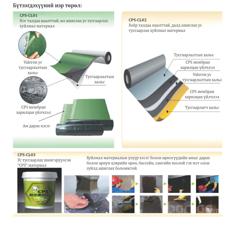 CPS төрлийн ус тусгаарлах хуйлмал материалыг Америкийн “Валерон” гэх сайн чанарын бат бэх хальстай хослуулан дээд зэрэглэлийн ус нэвтрүүлдэггүй “Мембран” ус тусгаарлах материал үйлдвэрлэж хэрэглээнд нэвтрүүлээд байна. Энэ нь Ус нэвчилт шүүрэлтийн эсрэг бүхий л барилга байгууламжид зориулагдсан хамгаалалтын хуйлмал материал юм.