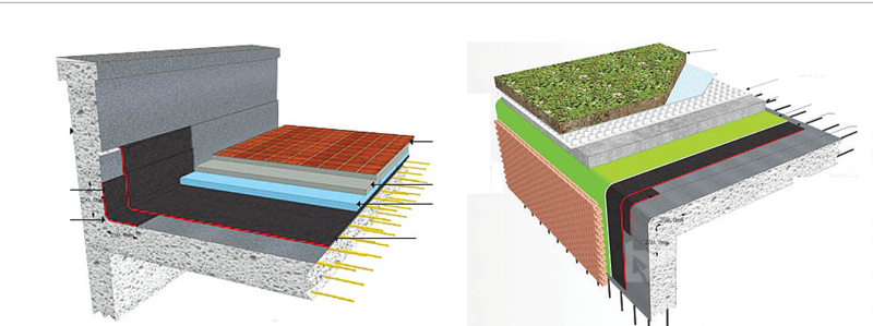 - CPS-Cl 02 болон 01 маркийн ус тусгаарлах хуйлмал материалыг ашиглан Ашиглалттай дээвэр буюу гражийн дээврийг 1-р зэрэглэлээр ус чийгнээс хамаалсан шийдэл. Энэ тохиолдолд газар дор болон гражийн дээвэр дээр зүлэг ногоо ургуулах, тоглоомын талбай, авто зам зэрэгт ашиглах бүрэн боломжтой.