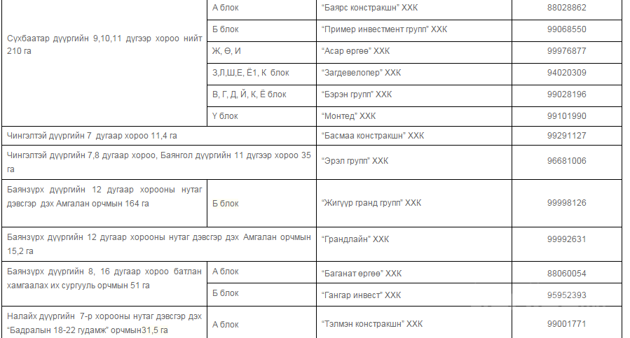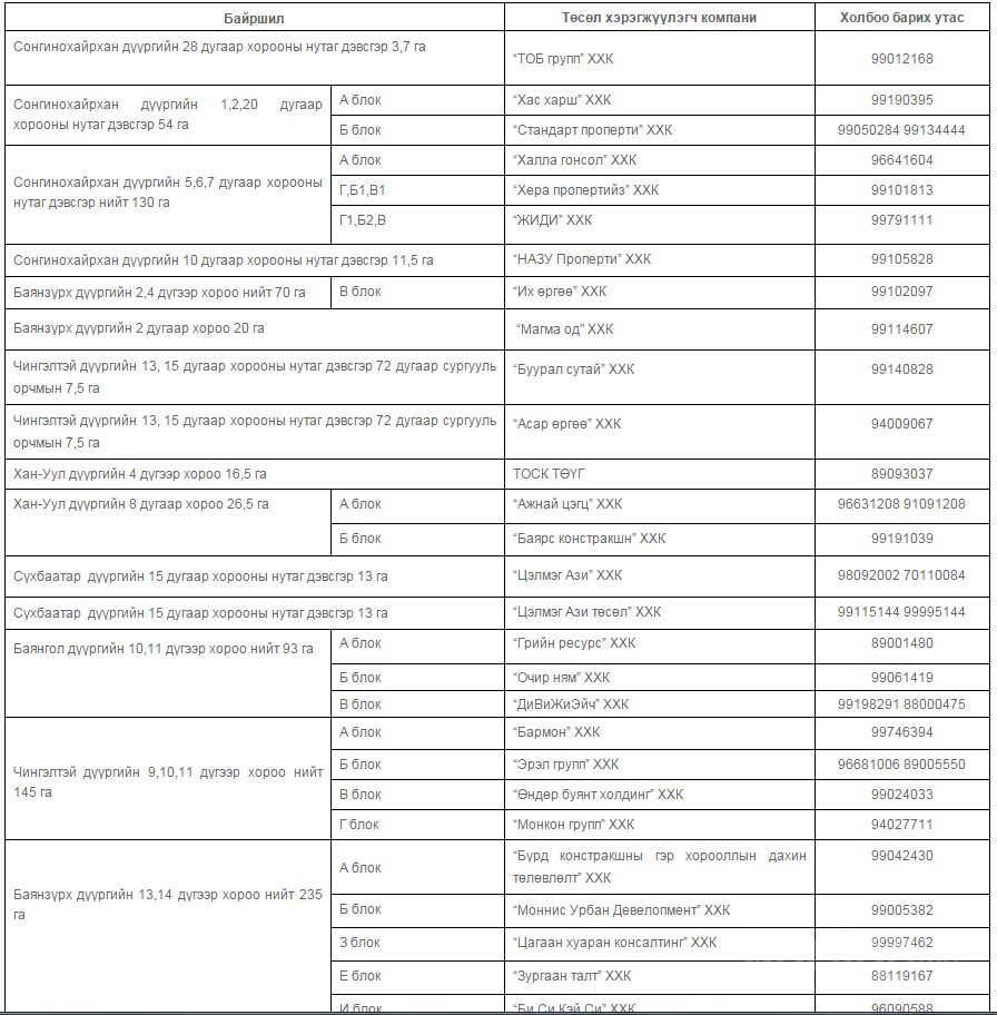 Дахин төлөвлөлтийн хүрээнд 2014 онд Ханын материалын орчим СХД-т 168 айлын орон сууц, СБД-ийн долоодугаар хороолол 100 айл орчимд “Бэрэн” группийн барьж буй барилгын А, Б блок, 2015 онд Батлан хамгаалах их сургуулийн орчим, БЗД-ийн 8,16 дугаар хороонд “Баганат өргөө” компани, “Гангар инвест” компани тус бүр 168 айлын оройн сууцыг, 2016 онд БЗД-ийн 14 хороололд “Зургаан талт компани”150 айлын орон сууц зэргийг ашиглалтад оруулаад байгаа юм. Удахгүй 100 айл орчимд гэр хорооллын дахин төлөвлөлтийн бүсэд “Бэрэн групп”-ийн барьж буй 800 айлын, БЗД-ийн 8, 16 дугаар хороод баригдаж буй “Гангар инвест”-ийн орон сууцууд шинээр ашиглалтад орох юм байна.