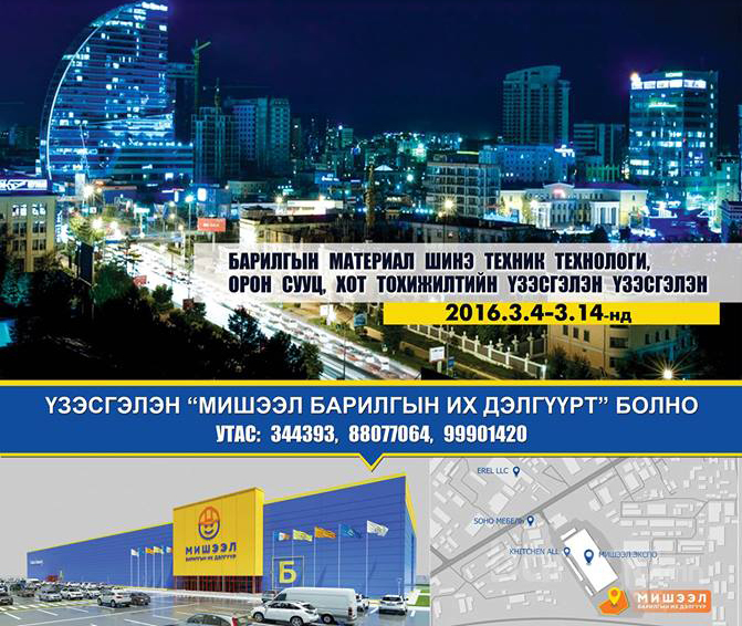 Барилга, Хот Байгуулалтын Яам Барилгын Хөгжлийн Төв, НОСК, ТОСК, Стандартчилал Хэмжил Зүйн Газар, “Мишээл Групп” ХХК хамтран жил бүр уламжлал болгон зохиодог “УЛААНБААТАР БАРИЛГА-2016” /Барилгын материал & шинэ техник технологи, орон сууц-хот тохижилт/ үзэсгэлэн 2016 оны 3 дугаар сарын 4-нөөс 3 дугаар сарын 14-ний өдрийг дуустал “Мишээл Экспо Төв”-ийн “Мишээл Мега Молл” төвийн үзэсгэлэнгийн танхимд 10 өдрийн турш зохион байгуулагдана.